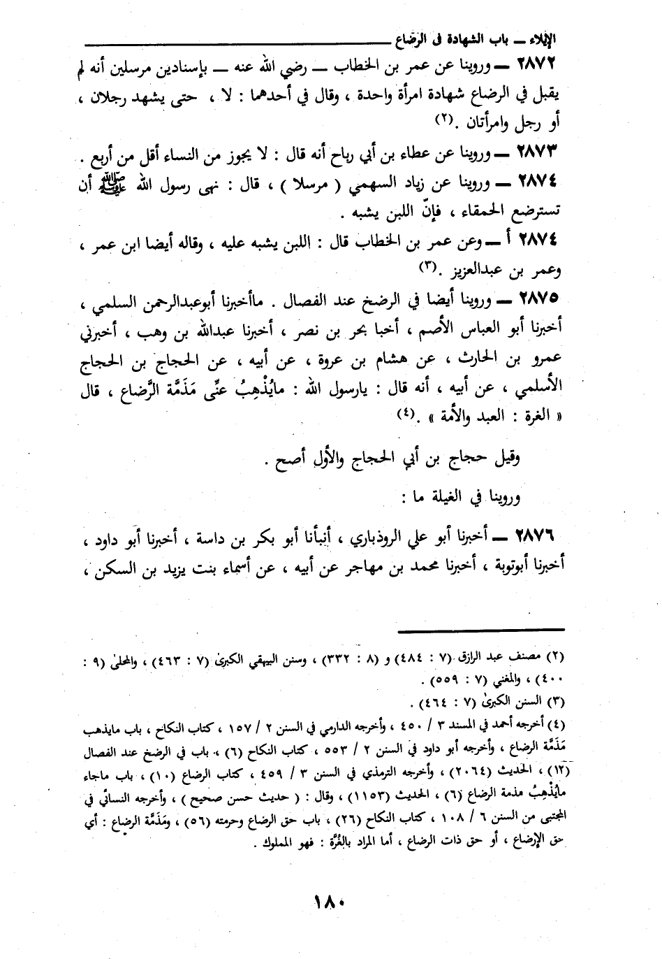 2872 - وَرُوِّينَا عَنْ عُمَرَ بْنِ الْخَطَّابِ رَضِيَ اللَّهُ عَنْهُ بإِسْنَادَيْنِ مُرْسَلَيْنِ أَنَّهُ لَمْ يَقْبَلْ فِي الرَّضَاعِ شَهَادَةَ امْرَأَةٍ وَاحِدَةٍ وَقَالَ فِي أَحَدِهِمَا: «§لَا حَتَّى يَشْهَدَ رَجُلَانِ، أَوْ رَجُلٌ وَامْرَأَتَانِ»