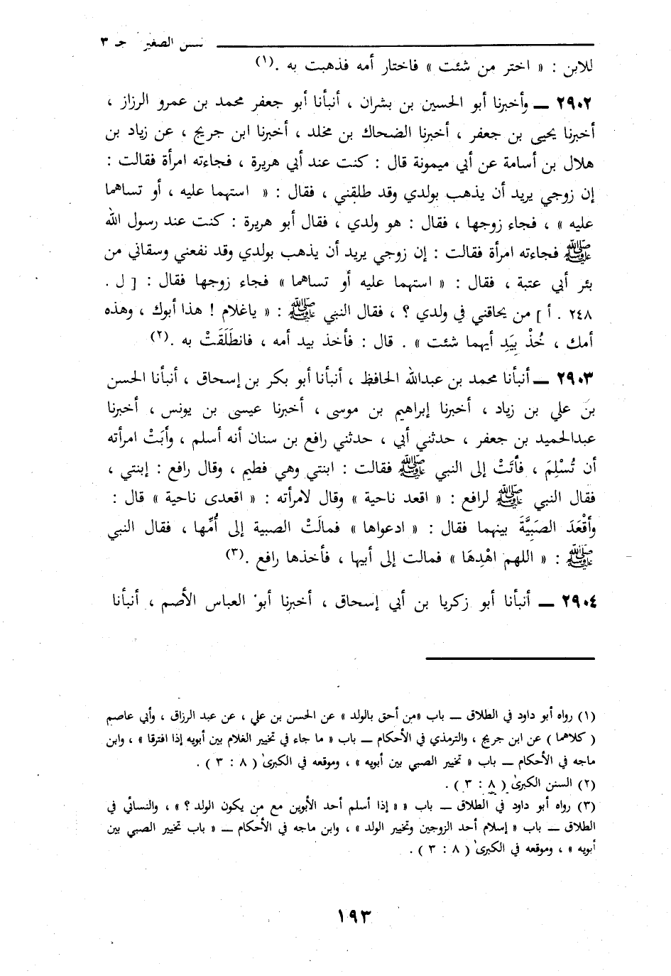 2903 - أَخْبَرَنَا مُحَمَّدُ بْنُ عَبْدِ اللَّهِ الْحَافِظُ، أنا أَبُو بَكْرِ بْنُ إِسْحَاقَ، نا الْحَسَنُ بْنُ عَلِيِّ بْنِ زِيَادٍ، نا إِبْرَاهِيمُ بْنُ مُوسَى، نا عِيسَى بْنُ يُونُسَ، نا عَبْدُ الْحَمِيدِ بْنُ جَعْفَرٍ، حَدَّثَنِي أَبِي، حَدَّثَنِي رَافِعُ بْنُ سِنَانٍ، أَنَّهُ أَسْلَمَ، وَأَبَتِ امْرَأَتُهُ أَنْ تُسْلِمَ، وَأَتَتْ إِلَى النَّبِيِّ صَلَّى اللهُ عَلَيْهِ وَسَلَّمَ فَقَالَتِ: ابْنَتِي وَهِيَ فَطِيمٌ، فَقَالَ رَافِعٌ: «ابْنَتِي» فَقَالَ النَّبِيُّ صَلَّى اللهُ عَلَيْهِ وَسَلَّمَ لِرَافِعٍ: «§اقْعُدْ نَاحِيَةً» وَقَالَ لِامْرَأَتِهِ: «اقْعُدِي نَاحِيَةً» قَالَ: وَأُقْعَدَ الصِّبْيَةَ بَيْنَهُمَا، فَقَالَ: «ادْعُوَاهَا» فَمَالَتِ الصِّبْيَةُ إِلَى أُمِّهَا، فَقَالَ النَّبِيُّ صَلَّى اللهُ عَلَيْهِ وَسَلَّمَ: «اللَّهُمَّ اهْدِهَا» فَمَالَتْ إِلَى أَبِيهَا فَأَخَذَهَا