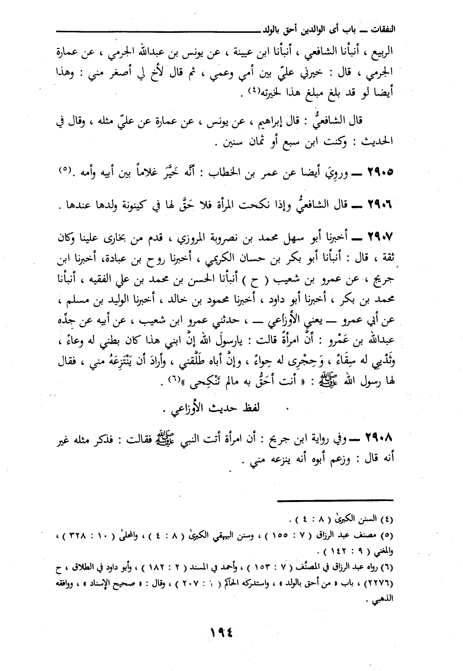 2907 - أَخْبَرَنَا أَبُو سَهْلٍ مُحَمَّدُ بْنُ نَصْرَوَيْهِ الْمَرْوَزِيُّ، قَدِمَ مِنْ بُخَارَى عَلَيْنَا وَكَانَ ثِقَةً قَالَ: أنا أَبُو بَكْرِ بْنُ حَسَّانَ الْكَرِيمِيُّ، نا رَوْحُ بْنُ عُبَادَةَ، نا ابْنُ جُرَيْجٍ، عَنْ عَمْرِو بْنِ شُعَيْبٍ، ح، أنا الْحَسَنُ بْنُ مُحَمَّدِ بْنِ عَلِيٍّ الْفَقِيهُ، أنا مُحَمَّدُ بْنُ بَكْرٍ، نا أَبُو دَاوُدَ، نا مَحْمُودُ بْنُ خَالِدٍ، نا الْوَلِيدُ بْنُ مُسْلِمٍ، عَنْ أَبِي عَمْرٍو يَعْنِي الْأَوْزَاعِيَّ، حَدَّثَنِي عَمْرُو بْنُ شُعَيْبٍ، عَنْ أَبِيهِ، عَنْ جَدِّهِ عَبْدِ اللَّهِ بْنِ عَمْرٍو أَنَّ امْرَأَةً قَالَتْ: يَا رَسُولَ اللَّهِ إِنَّ §ابْنِي هَذَا كَانَ بَطْنِي لَهُ وِعَاءً، وَثَدْيِي لَهُ سِقَاءً، وَحِجْرِي لَهُ حَوَاءً، وَإِنَّ أَبَاهُ طَلَّقَنِي، وَأَرَادَ أَنْ يَنْزِعَهُ مِنِّي -[195]-، فَقَالَ لَهَا رَسُولُ اللَّهِ صَلَّى اللهُ عَلَيْهِ وَسَلَّمَ: «أَنْتِ أَحَقُّ بِهِ مَا لَمْ تَنْكِحِي» لَفْظُ حَدِيثِ الْأَوْزَاعِيِّ،