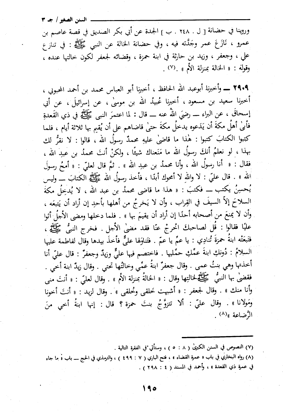 2909 - وَأَخْبَرَنَا أَبُو عَبْدِ اللَّهِ الْحَافِظُ، نا أَبُو الْعَبَّاسِ مُحَمَّدُ بْنُ أَحْمَدَ الْمَحْبُوبِيُّ، نا سَعِيدُ بْنُ مَسْعُودٍ، نا عُبَيْدُ اللَّهِ بْنُ مُوسَى، نا إِسْرَائِيلُ، عَنْ أَبِي إِسْحَاقَ، عَنِ الْبَرَاءٍ قَالَ: لَمَّا § «اعْتَمَرَ رَسُولُ اللَّهِ صَلَّى اللهُ عَلَيْهِ وَسَلَّمَ فِي ذِي الْقَعْدَةِ فَأَبَى أَهْلُ مَكَّةَ أَنْ يَدَعُوهُ يَدْخُلُ مَكَّةَ حَتَّى قَاضَاهُمْ عَلَى أَنْ يُقِيمَ بِهَا ثَلَاثَةَ أَيَّامٍ، فَلَمَّا كَتَبُوا الْكِتَابَ» كَتَبُوا: هَذَا مَا قَاضَى عَلَيْهِ مُحَمَّدٌ رَسُولُ اللَّهِ صَلَّى اللهُ عَلَيْهِ وَسَلَّمَ قَالُوا: لَا نُقِرُّ لَكَ بِهَذَا، وَلَوْ نَعْلَمُ أَنَّكَ رَسُولُ اللَّهِ مَا مَنَعْنَاكَ شَيْئًا، وَلَكِنْ أَنْتَ مُحَمَّدُ بْنُ عَبْدِ اللَّهِ، قَالَ: «أَنَا رَسُولُ اللَّهِ، وَأَنَا مُحَمَّدُ بْنُ عَبْدِ اللَّهِ» يَا عَلِيُّ: «امْحُ رَسُولَ اللَّهِ» قَالَ عَلِيٌّ: «لَا وَاللَّهِ لَا أَمْحُوكَ أَبَدًا» فَأَخَذَ رَسُولُ اللَّهِ صَلَّى اللهُ عَلَيْهِ وَسَلَّمَ الْكِتَابَ، وَلَيْسَ يُحْسِنُ يَكْتُبُ مَكَانَ رَسُولِ اللَّهِ صَلَّى اللهُ عَلَيْهِ وَسَلَّمَ فَكَتَبَ: «هَذَا مَا قَاضَى عَلَيْهِ مُحَمَّدُ بْنُ عَبْدِ اللَّهِ، أَنْ لَا يَدْخِلَ مَكَّةَ السِّلَاحُ إِلَّا السَّيْفَ فِي الْقِرَابِ، وَأَلَّا يَخْرُجَ مِنْ أَهْلِهَا أَحَدٌ أَرَادَ أَنْ يَتْبَعَهُ، وَأَنْ لَا يَمْنَعَ أَحَدًا مِنْ أَصْحَابِهِ إِنْ أَرَادَ أَنْ يُقِيمَ بِهَا» فَلَمَّا دَخَلَهَا وَمَضَى الْأَجَلُ أَتَوْا عَلِيًّا فَقَالُوا: قُلْ لِصَاحِبِكَ فَلْيَخْرُجْ عَنَّا فَقَدْ مَضَى الْأَجَلُ، فَخَرَجَ رَسُولُ اللَّهِ صَلَّى اللهُ عَلَيْهِ وَسَلَّمَ فَتَبِعَتْهُمُ ابْنَةُ حَمْزَةَ فَنَادَتْ: يَا عَمُّ يَا عَمُّ، فَتَنَاوَلَهَا عَلِيٌّ فَأَخَذَ بِيَدِهَا، وَقَالَ لِفَاطِمَةَ: " دُونَكِ، فَحَمَلَتْهَا فَاخْتَصَمَ فِيهَا عَلِيٌّ وَزَيْدٌ وَجَعْفَرٌ، فَقَالَ عَلِيٌّ: «أَنَا آخُذُهَا وَهِيَ ابْنَةُ عَمِّي» قَالَ جَعْفَرٌ: «ابْنَةُ عَمِّي وَخَالَتُهَا تَحْتِي» وَقَالَ زَيْدٌ: «ابْنَةُ أَخِي» فَقَضَى رَسُولُ اللَّهِ صَلَّى اللهُ عَلَيْهِ وَسَلَّمَ لِخَالَتِهَا وَقَالَ: «الْخَالَةُ بِمَنْزِلَةِ الْأُمِّ» وَقَالَ لِعَلِيٍّ: «أَنْتَ مِنِّي وَأَنَا مِنْكَ» وَقَالَ لِجَعْفَرٍ: «أَشْبَهْتَ خَلْقِي وَخُلُقِي» وَقَالَ لِزَيْدٍ: «أَنْتَ أَخُونَا وَمَوْلَانَا» -[196]- وَهَكَذَا رَوَاهُ الْبُخَارِيُّ، عَنْ عُبَيْدِ اللَّهِ بْنِ مُوسَى، فَأَدْرَجَ قِصَّةَ حَمْزَةَ فِي قِصَّةِ الْقَضِيَّةِ وَرَوَاهُ زَكَرِيَّا بْنُ أَبِي زَائِدَةَ، عَنْ أَبِي إِسْحَاقَ، عَنِ الْبَرَاءِ، فِي قِصَّةِ الْقَضِيَّةِ، ثُمَّ قَالَ: قَالَ أَبُو إِسْحَاقَ، وَحَدَّثَنِي هَانِئُ بْنُ هَانِئٍ، وَهُبَيْرَةُ بْنُ يَرِيمَ، عَنْ عَلِيِّ بْنِ أَبِي طَالِبٍ قَالَ: فَاتَّبَعَتْهُمُ ابْنَةُ حَمْزَةَ تُنَادِي: يَا عَمُّ يَا عَمُّ، فَذَكَرَ مَعْنَاهُ، وَأَتَمَّ مِنْهُ، وَيُحْتَمَلُ أَنْ يَكُونَ أَبُو إِسْحَاقَ سَمِعَ مِنَ الْبَرَاءِ قِصَّةَ ابْنَةِ حَمْزَةَ مُخْتَصَرَةً كَمَا رُوِّينَا، وَسَمِعَهَا أَتَمَّ مِنْ ذَلِكَ مِنْ هَانِئِ بْنِ هَانِئٍ، وَهُبَيْرَةَ عَنْ عَلِيٍّ فَرَوَاهَا، وَلَيْسَ فِيمَا رُوِّينَا عَنْهُ عَنِ الْبَرَاءِ ذِكْرُ حُجَّةِ زَيْدٍ وَجَعْفَرٍ وَعَلِيٍّ، وَهُوَ فِي رِوَايَتِهِ عَنْهُمَا، عَنْ عَلِيٍّ وَاللَّهُ أَعْلَمُ