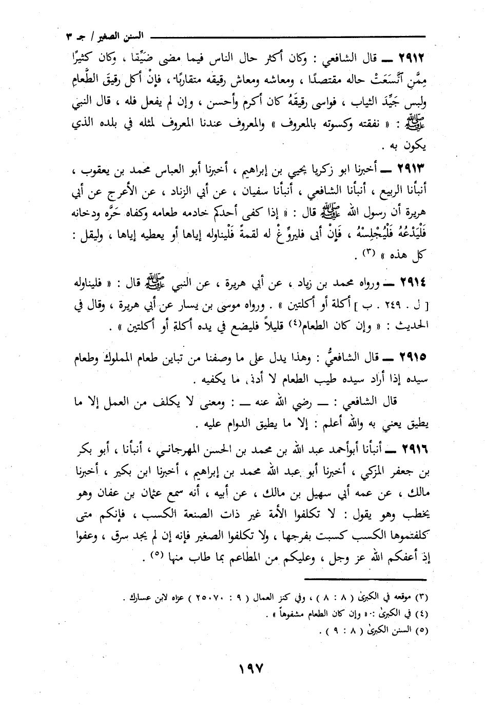 2913 - أَخْبَرَنَا أَبُو زَكَرِيَّا يَحْيَى بْنُ إِبْرَاهِيمَ، نا أَبُو الْعَبَّاسِ مُحَمَّدُ بْنُ يَعْقُوبَ، أنا الرَّبِيعُ، أنا الشَّافِعِيُّ، أنا سُفْيَانُ، عَنْ أَبِي الزِّنَادِ، عَنِ الْأَعْرَجِ، عَنْ أَبِي هُرَيْرَةَ، أَنَّ رَسُولَ اللَّهِ صَلَّى اللهُ عَلَيْهِ وَسَلَّمَ قَالَ: § «إِذَا كَفَى أَحَدَكُمْ خَادِمُهُ طَعَامَهُ وَكَفَّاهُ حَرَّهُ وَدُخَانَهُ فَلْيَدْعُهُ فَلْيُجْلِسْهُ، فَإِنْ أَبِي فَلْيُرَوِّغْ لَهُ لُقْمَةً فَلْيُنَاوِلْهُ إِيَّاهَا أَوْ يُعْطِيهِ إِيَّاهَا» أَوْ كَلِمَةً هَذَا مَعْنَاهَا