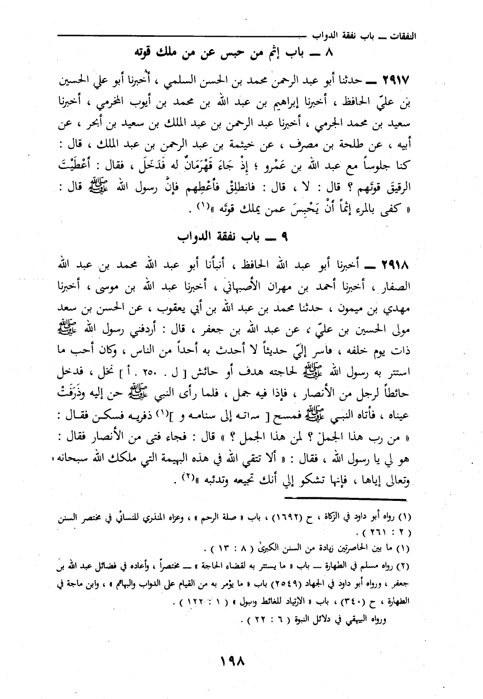 2917 - حَدَّثَنَا أَبُو عَبْدِ الرَّحْمَنِ مُحَمَّدُ بْنُ الْحُسَيْنِ السُّلَمِيُّ، نا أَبُو عَلِيٍّ الْحُسَيْنُ بْنُ عَلِيٍّ الْحَافِظُ، نا إِبْرَاهِيمُ بْنُ عَبْدِ اللَّهِ بْنِ مُحَمَّدِ بْنِ أَيُّوبَ الْجَرْمِيُّ، نَا سَعِيدُ بْنُ مُحَمَّدٍ الْجَرْمِيُّ، نا عَبْدُ الرَّحْمَنِ بْنُ عَبْدِ الْمَلِكِ بْنِ سَعِيدِ بْنِ أَبْجَرَ، عَنْ أَبِيهِ، عَنْ طَلْحَةَ بْنِ مُصَرِّفٍ، عَنْ خَيْثَمَةَ بْنِ عَبْدِ الرَّحْمَنِ بْنِ عَبْدِ الْمَلِكِ، قَالَ: كُنَّا جُلُوسًا مَعَ عَبْدِ اللَّهِ بْنِ عَمْرٍو، إِذْ جَاءَ قَهْرَمَانٌ لَهُ فَدَخَلَ فَقَالَ: «§أَعْطَيْتَ الرَّقِيقَ قُوتَهُمْ؟» قَالَ: لَا، قَالَ: فَانْطَلِقْ فَأَعْطِهِمْ وقَالَ: قَالَ رَسُولَ اللَّهِ صَلَّى اللهُ عَلَيْهِ وَسَلَّمَ «كَفَى بِالْمَرْءِ إِثْمًا أَنْ يَحْبِسَ عَمَّنْ يَمْلِكُ قُوتَهُ»