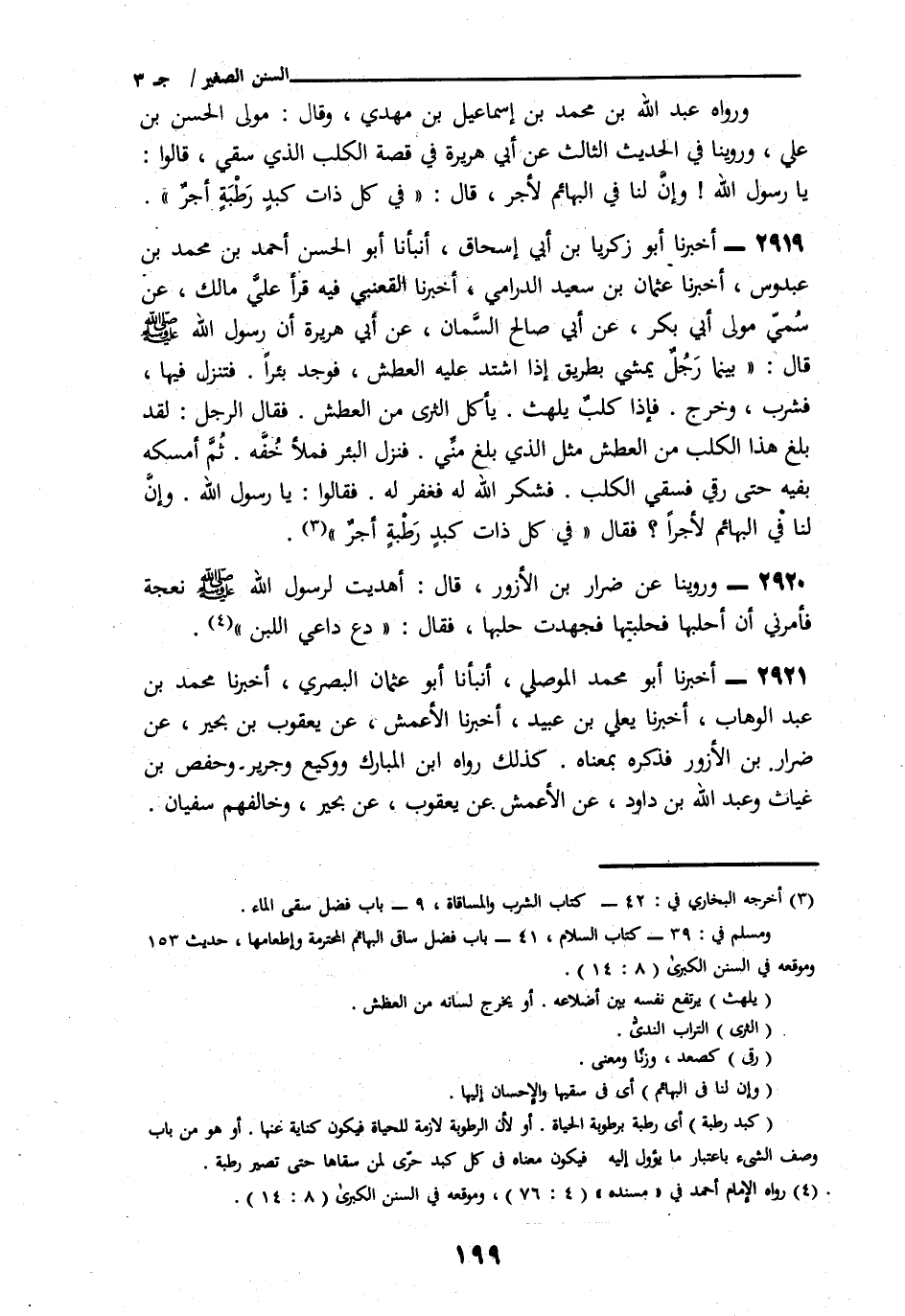 2919 - أَخْبَرَنَا أَبُو زَكَرِيَّا بْنُ أَبِي إِسْحَاقَ، أَنَا أَبُو الْحَسَنِ أَحْمَدُ بْنُ مُحَمَّدِ بْنِ عَبْدُوسَ، نَا عُثْمَانُ بْنُ سَعِيدٍ الدَّارِمِيُّ، نَا الْقَعْنَبِيُّ، فِيمَا قَرَأَ عَلَى مَالِكٍ، عَنْ سُمَيٍّ، مَوْلَى أَبِي بَكْرٍ، عَنْ أَبِي صَالِحٍ السَّمَّانِ، عَنْ أَبِي هُرَيْرَةَ، أَنَّ رَسُولَ اللَّهِ صَلَّى اللهُ عَلَيْهِ وَسَلَّمَ قَالَ: «§بَيْنَمَا رَجُلٌ يَمْشِي بِطَرِيقٍ اشْتَدَّ عَلَيْهِ الْعَطَشُ، فَوَجَدَ بِئْرًا فَنَزَلَ فِيهِ، فَشَرِبَ ثُمَّ خَرَجَ فَإِذَا كَلْبٌ يَلْهَثُ يَأْكُلُ الثَّرَى مِنَ الْعَطَشِ» فَقَالَ الرَّجُلُ: «لَقَدْ بَلَغَ هَذَا الْكَلْبَ مِنَ الْعَطَشِ مِثْلُ الَّذِي كَانَ بَلَغَنِي، فَنَزَلَ الْبِئْرَ فَمَلَأَ خُفَّهُ، ثُمَّ أَمْسَكَهُ بِفِيهِ حَتَّى ارتَقَى فَسَقَى الْكَلْبَ فَشَكَرَ اللَّهُ لَهُ فَغَفَرَ لَهُ» فَقَالُوا: يَا رَسُولَ اللَّهِ، وَإِنَّ لَنَا فِي الْبَهَائِمِ لَأَجْرًا؟ فَقَالَ: «فِي كُلِّ ذَاتِ كَبِدٍ رَطْبَةٍ أَجْرٌ»