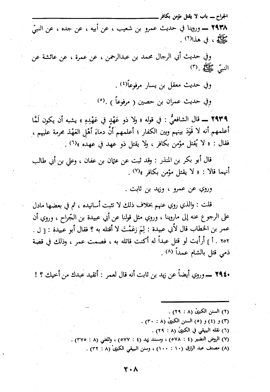 2939 - قَالَ أَبُو بَكْرِ بْنُ الْمُنْذِرِ: وَقَدْ ثَبَتَ عَنْ عُثْمَانَ بْنِ عَفَّانَ، وَعَلِيِّ بْنِ أَبِي طَالِبٍ، أَنَّهُمَا قَالَا: «§لَا يُقْتَلُ مُؤْمِنٌ بِكَافِرٍ» وَرُوِيَ عَنْ عَمْرٍو، وَزَيْدِ بْنِ ثَابِتٍ قُلْتُ: وَالَّذِي رُوِيَ عَنْهُمْ، بِخِلَافِ ذَلِكَ لَا تَثْبُتُ أَسَانِيدُهُ، ثُمَّ فِي بَعْضِهَا مَا دَلَّ عَلَى الرُّجُوعِ عَنْهُ إِلَى مَا رُوِّينَا، وَرُوِيَ مِثْلُ قَوْلِنَا عَنْ أَبِي عُبَيْدَةَ بْنِ الْجَرَّاحِ وَرُوِيَ أَنَّ عُمَرَ بْنَ الْخَطَّابِ قَالَ لِأَبِي عُبَيْدَةَ: «لِمَ زَعَمْتَ لَا أَقْتُلُهُ بِهِ؟» فَقَالَ أَبُو عُبَيْدَةَ: أَرَأَيْتَ لَوْ قَتَلَ عَبْدًا لَهُ أَكُنْتَ قَاتِلَهُ بِهِ؟ فَصَمَتَ عُمَرُ، وَذَلِكَ فِي قِصَّةِ ذِمِّيٍّ قُتِلَ بِالشَّامِ عَمْدًا "