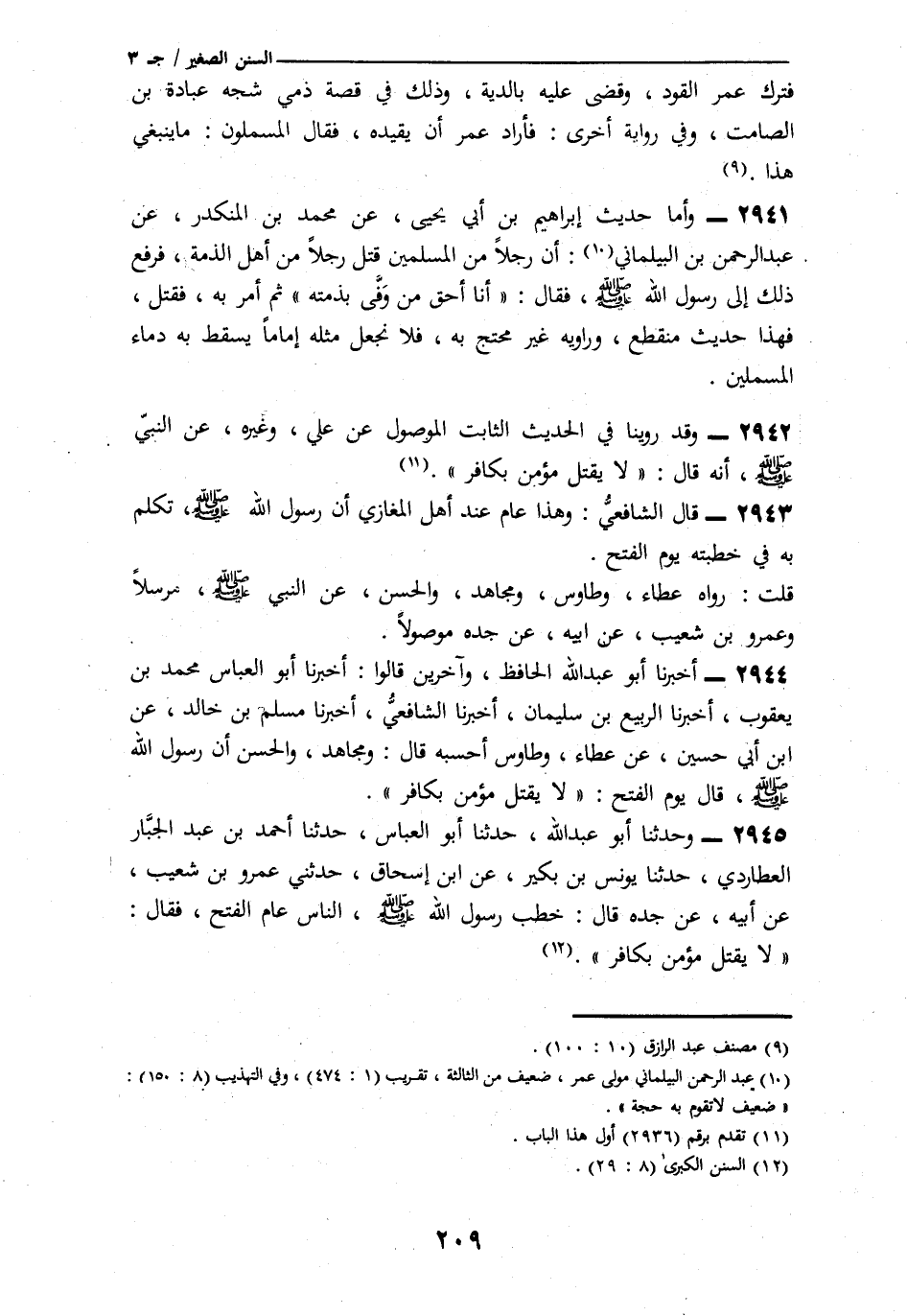 2942 - وَقَدْ رُوِّينَا فِي الْحَدِيثِ الثَّابِتِ الْمَوْصُولِ، عَنْ عَلِيٍّ، وَغَيْرِهِ، عَنِ النَّبِيِّ صَلَّى اللهُ عَلَيْهِ وَسَلَّمَ «§لَا يُقْتَلُ مُؤْمِنٌ بِكَافِرٍ» -[210]-