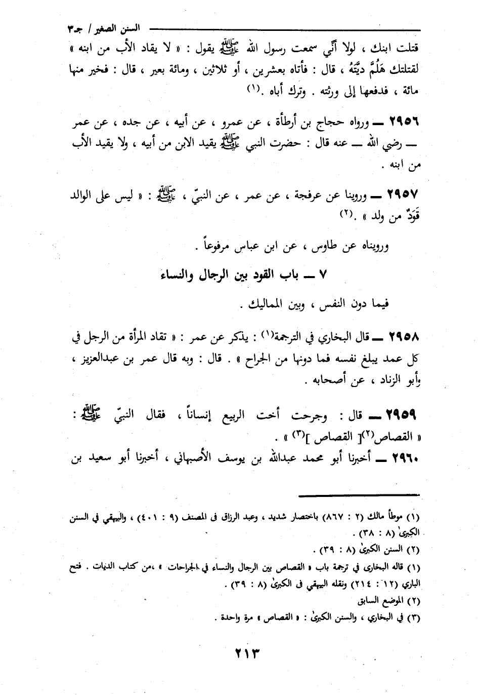 2957 - وَرُوِّينَا عَنْ عَرْفَجَةَ، عَنْ عُمَرَ، عَنِ النَّبِيِّ صَلَّى اللهُ عَلَيْهِ وَسَلَّمَ: § «لَيْسَ عَلَى الْوَالِدِ قَوَدٌ مِنْ وَلَدٍ» وَرُوِّينَاهُ عَنْ طَاوُسٍ، عَنِ ابْنِ عَبَّاسٍ، مَرْفُوعًا