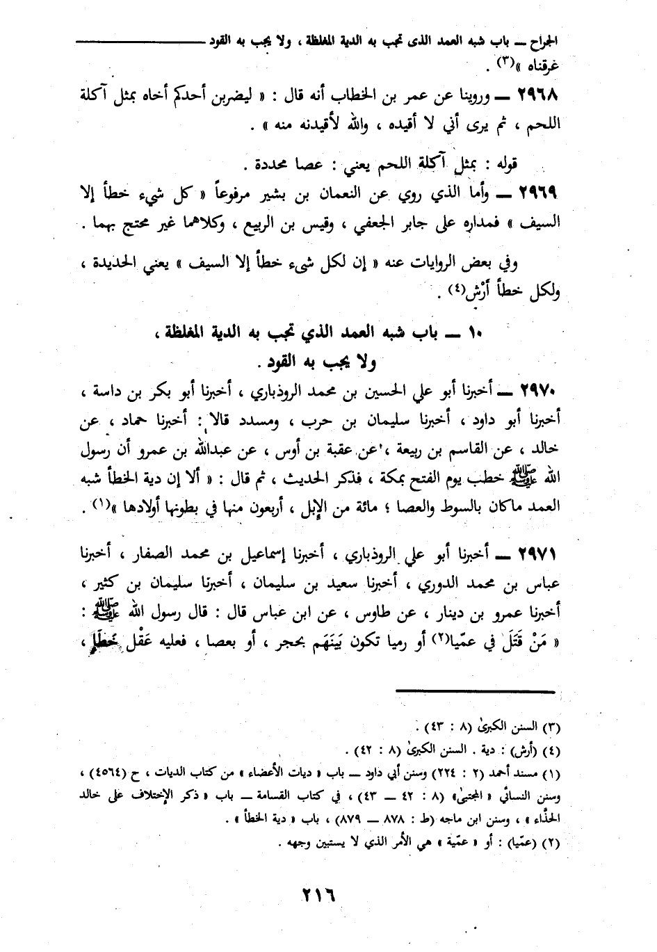 2970 - أَخْبَرَنَا أَبُو عَلِيٍّ الْحُسَيْنُ بْنُ مُحَمَّدٍ الرُّوذْبَارِيُّ، نا أَبُو بَكْرِ بْنُ دَاسَةَ، نا أَبُو دَاوُدَ، نا سُلَيْمَانُ بْنُ حَرْبٍ، وَمُسَدَّدٌ، قَالَا: نَا حَمَّادٌ، عَنْ خَالِدٍ، عَنِ الْقَاسِمِ بْنِ رَبِيعَةَ، عَنْ عُقْبَةَ بْنِ أَوْسٍ، عَنْ عَبْدِ اللَّهِ بْنِ عَمْرٍو،: أَنَّ رَسُولَ اللَّهِ صَلَّى اللهُ عَلَيْهِ وَسَلَّمَ خَطَبَ يَوْمَ الْفَتْحِ بِمَكَّةَ، فَذَكَرَ الْحَدِيثَ، ثُمَّ قَالَ: § «أَلَا إِنَّ دِيَةَ الْخَطَأِ شِبْهِ الْعَمْدِ مَا كَانَ بِالسَّوْطِ وَالْعَصَا، مِائَةٌ مِنَ الْإِبِلِ، أَرْبَعُونَ مِنْهَا فِي بُطُونِهَا أَوْلَادُهَا»