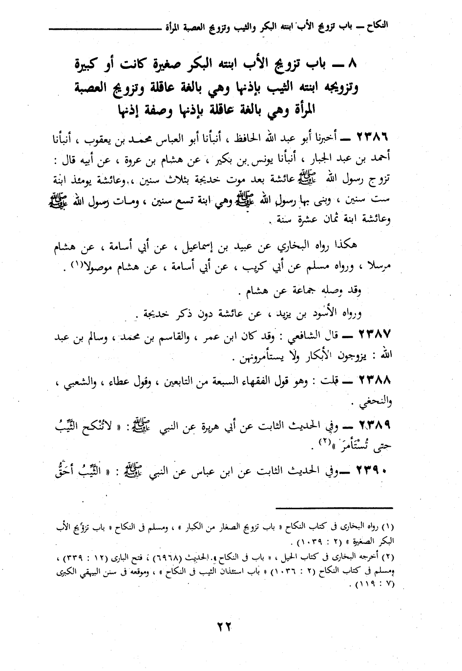 2389 - وَفِي الْحَدِيثِ الثَّابِتِ عَنْ أَبِي هُرَيْرَةَ، عَنِ النَّبِيِّ صَلَّى اللهُ عَلَيْهِ وَسَلَّمَ: § «لَا تُنْكَحُ الثَّيِّبُ حَتَّى تُسْتَأْمَرَ»