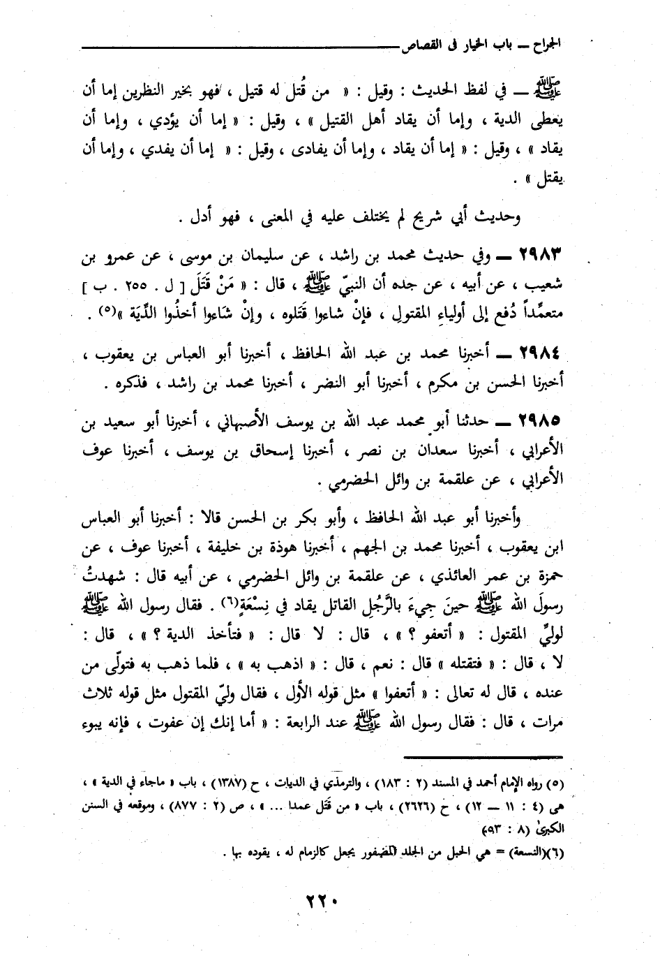 2985 - وَأَخْبَرَنَا أَبُو عَبْدِ اللَّهِ الْحَافِظُ، وَأَبُو بَكْرِ بْنُ الْحَسَنِ قَالَا: نا أَبُو الْعَبَّاسِ بْنُ يَعْقُوبَ، نا مُحَمَّدُ بْنُ الْجَهْمِ، نا هَوْذَةُ بْنُ خَلِيفَةَ، نا عَوْفٌ، عَنْ حَمْزَةَ بْنِ عَمْرٍو الْعَائِذِيِّ، عَنْ عَلْقَمَةَ بْنِ وَائِلٍ الْحَضْرَمِيِّ، عَنْ أَبِيهِ، قَالَ: شَهِدْتُ رَسُولَ اللَّهِ صَلَّى اللهُ عَلَيْهِ وَسَلَّمَ حِينَ جِيءَ بِالرَّجُلِ الْقَاتِلِ يُقَادُ فِي نِسْعَةٍ فَقَالَ رَسُولُ اللَّهِ صَلَّى اللهُ عَلَيْهِ وَسَلَّمَ لِوَلِيِّ الْمَقْتُولِ: «§أَتَعْفُو؟» قَالَ: لَا. قَالَ: «فَتَأْخُذُ الدِّيَةَ؟» قَالَ: لَا. قَالَ: «فَتَقْتُلُهُ» قَالَ: نَعَمْ. قَالَ: «اذْهَبْ بِهِ» فَلَمَّا ذَهَبَ بِهِ فَتَوَلَّى مِنْ عِنْدِهِ قَالَ لَهُ: «تَعَالَى أَتَعْفُو» مِثْلَ قَوْلِهِ الْأَوَّلِ، فَقَالَ وَلِيُّ الْمَقْتُولِ مِثْلَ قَوْلِهِ ثَلَاثَ مَرَّاتٍ قَالَ: فَقَالَ الرَّسُولُ صَلَّى اللهُ عَلَيْهِ وَسَلَّمَ عِنْدَ الرَّابِعَةِ: «أَمَا إِنَّكَ إِنْ عَفَوْتَ، فَإِنَّهُ يَبُوءُ -[221]- بِإِثْمِكَ، وَإِثْمِ صَاحِبِكَ» قَالَ: فَتَرَكَهُ. قَالَ: فَأَنَا رَأَيْتُهُ يَجُرُّ نِسْعَتَهُ. لَفْظُ حَدِيثِ هَوْذَةَ