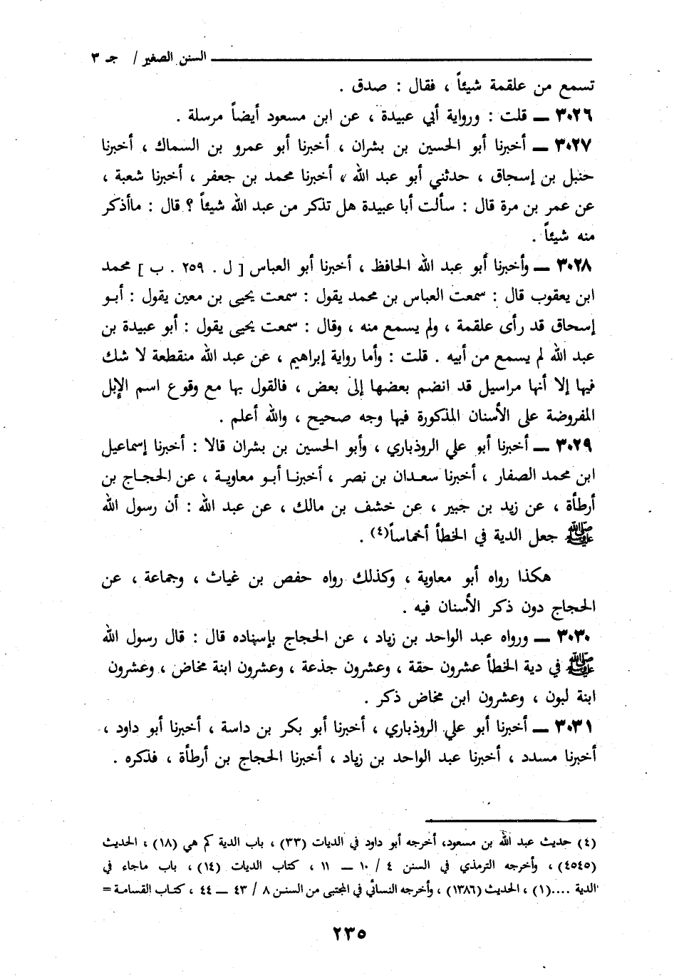3028 - وَأَخْبَرَنَا أَبُو عَبْدِ اللَّهِ الْحَافِظُ، نا أَبُو الْعَبَّاسِ مُحَمَّدُ بْنُ يَعْقُوبَ قَالَ: سَمِعْتُ يَحْيَى بْنَ مَعِينٍ، يَقُولُ: أَبُو إِسْحَاقَ قَدْ رَأَى عَلْقَمَةَ، وَلَمْ يَسْمَعْ مِنْهُ وَقَالَ: سَمِعْتُ يَحْيَى يَقُولُ: أَبُو عُبَيْدَةَ بْنُ عَبْدِ اللَّهِ لَمْ يَسْمَعْ مِنْ أَبِيهِ. قُلْتُ وَأَمَّا رِوَايَةُ إِبْرَاهِيمَ، عَنْ عَبْدِ اللَّهِ § «مُنْقَطِعَةٌ لَا شَكَّ فِيهَا إِلَّا أَنَّهَا مَرَاسِيلُ قَدِ انْضَمَّ بَعْضُهَا إِلَى بَعْضٍ، فَالْقَوْلُ بِهَا مَعَ وُقُوعِ اسْمِ الْإِبِلِ الْمَفْرُوضَةِ عَلَى الْأَسْنَانِ الْمَذْكُورَةِ فِيهَا وَجْهٌ صَحِيحٌ، وَاللهُ أَعْلَمُ»
