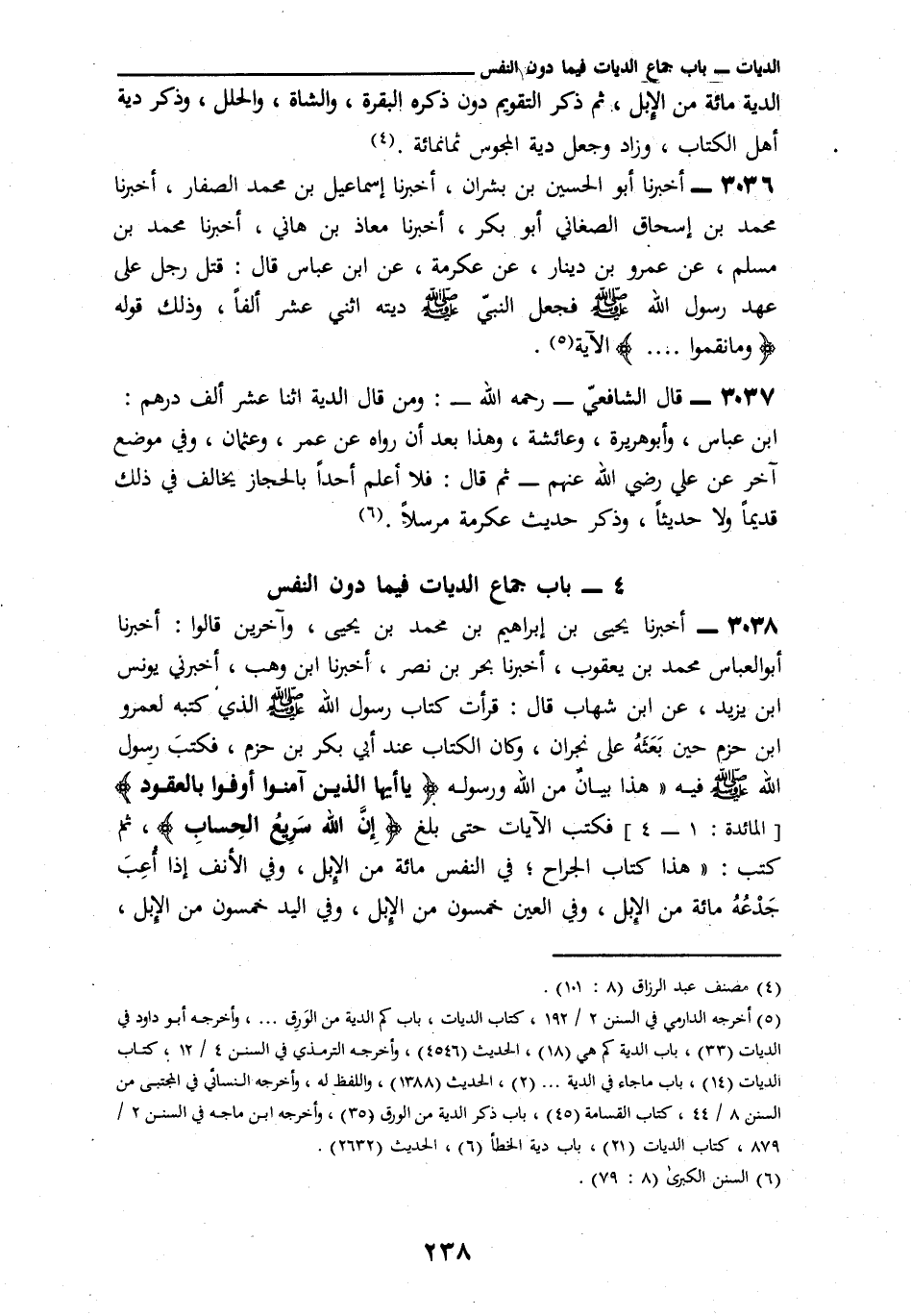 3038 - أَخْبَرَنَا يَحْيَى بْنُ إِبْرَاهِيمَ بْنِ مُحَمَّدِ بْنِ يَحْيَى وَآخَرُونَ قَالُوا: نا أَبُو الْعَبَّاسِ مُحَمَّدُ بْنُ يَعْقُوبَ، نا بَحْرُ بْنُ نَصْرٍ، نا ابْنُ وَهْبٍ، نَا يُونُسُ بْنُ يَزِيدَ، عَنِ ابْنِ شِهَابٍ، قَالَ: قَرَأْتُ كِتَابَ رَسُولِ اللَّهِ صَلَّى اللهُ عَلَيْهِ وَسَلَّمَ الَّذِي كَتَبَهُ لِعَمْرِو بْنِ حَزْمٍ حِينَ بَعَثَهُ عَلَى نَجْرَانَ وَكَانَ الْكِتَابُ عِنْدَ أَبِي بَكْرِ بْنِ حَزْمٍ، فَكَتَبَ رَسُولُ اللَّهِ صَلَّى اللهُ عَلَيْهِ وَسَلَّمَ فِيهِ: " §هَذَا بَيَانٌ مِنَ اللَّهِ وَرَسُولِهِ: {يَا أَيُّهَا الَّذِينَ آمَنُوا أَوْفُوا بِالْعُقُودِ} [المائدة: 1] فَكَتَبَ الْآيَةَ حَتَّى بَلَغَ {إِنَّ اللَّهَ سَرِيعُ الْحِسَابِ} [آل عمران: 199] ثُمَّ كَتَبَ: هَذَا كِتَابُ الْجِرَاحِ فِي النَّفْسِ مِائَةٌ مِنَ الْإِبِلِ، وَفِي الْأَنْفِ إِذَا أُعِبَ جَدْعُهُ مِائَةٌ مِنَ الْإِبِلِ، وَفِي الْعَيْنِ خَمْسُونَ مِنَ الْإِبِلِ، وَفِي الْيَدِ خَمْسُونَ مِنَ الْإِبِلِ -[239]-، وَفِي الرَّجُلِ خَمْسُونَ مِنَ الْإِبِلِ، وَفِي كُلِّ إِصْبَعٍ مِمَّا هُنَالِكَ عَشْرٌ مِنَ الْإِبِلِ وَفِي الْمَأْمُومَةِ ثُلُثُ النَّفْسِ، وَفِي الْجَائِفَةِ ثُلُثُ النَّفْسِ، وَفِي الْمُنَقِّلَةَ خَمْسَ عَشْرَةَ مِنَ الْإِبِلِ، وَفِي الْمُوضِحَةِ خَمْسٌ مِنَ الْإِبِلِ، وَفِي السِّنِّ خَمْسٌ مِنَ الْإِبِلِ " قَالَ ابْنُ شِهَابٍ: " هَذَا الَّذِي قَرَأْتُ فِي الْكِتَابِ الَّذِي كَتَبَهُ رَسُولُ اللَّهِ صَلَّى اللهُ عَلَيْهِ وَسَلَّمَ عِنْدَ أَبِي بَكْرِ بْنِ حَزْمٍ