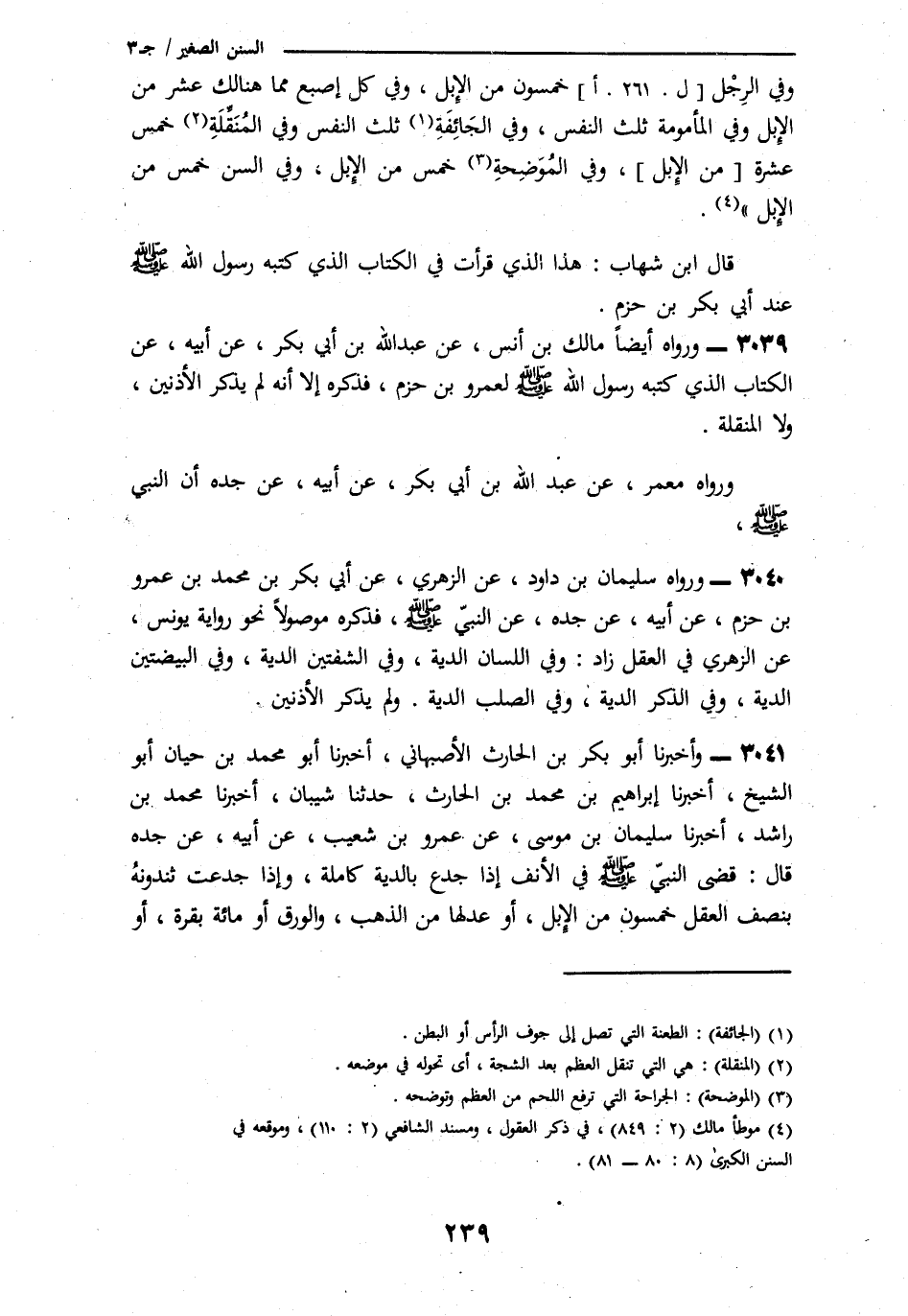 3039 - وَرَوَاهُ أَيْضًا مَالِكُ بْنُ أَنَسٍ، عَنْ عَبْدِ اللَّهِ بْنِ أَبِي بَكْرٍ، عَنْ أَبِيهِ، عَنِ الْكِتَابِ الَّذِي، § «كَتَبَهُ رَسُولُ اللَّهِ صَلَّى اللهُ عَلَيْهِ وَسَلَّمَ لِعَمْرِو بْنِ حَزْمٍ، فَذَكَرَهُ إِلَّا أَنَّهُ لَمْ يَذْكُرِ الْأُذُنَيْنِ وَلَا الْمُنَقِّلَةَ» وَرَوَاهُ مَعْمَرٌ، عَنْ عَبْدِ اللَّهِ بْنِ أَبِي بَكْرٍ، عَنْ أَبِيهِ، عَنْ جَدِّهِ، أَنَّ النَّبِيَّ صَلَّى اللهُ عَلَيْهِ وَسَلَّمَ