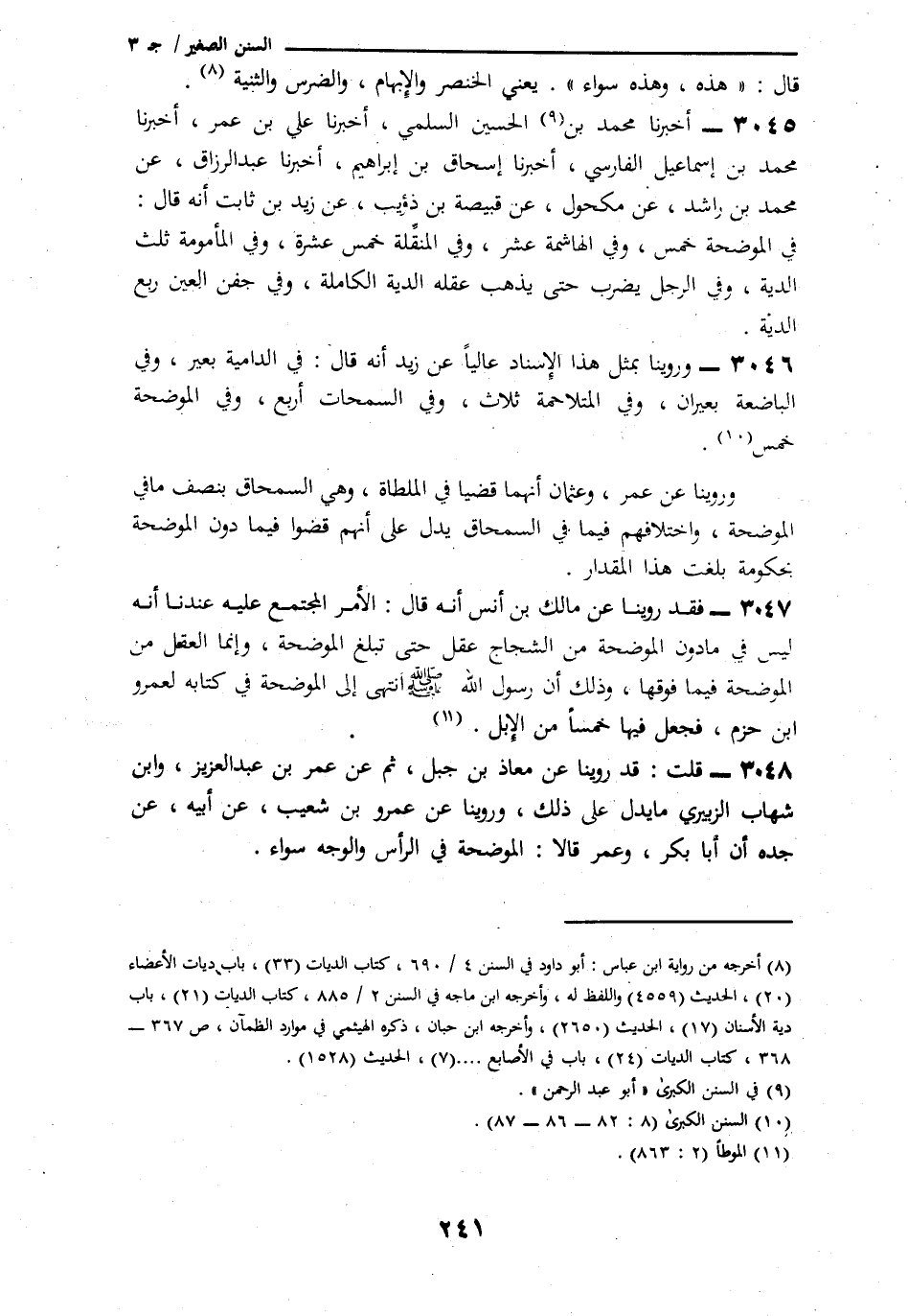 3046 - وَرُوِّينَا بِمِثْلِ، هَذَا الْإِسْنَادِ عَالِيًا عَنْ زَيْدٍ، أَنَّهُ قَالَ: «§فِي الدَّامِيَةِ بَعِيرٌ، وَفِي الْبَاضِعَةِ بَعِيرَانِ، وَفِي الْمُتَلَاحِمَةِ ثَلَاثٌ، وَفِي السَّمْحَاتِ أَرْبَعٌ، وَفِي الْمُوضِحَةِ خَمْسٌ»
