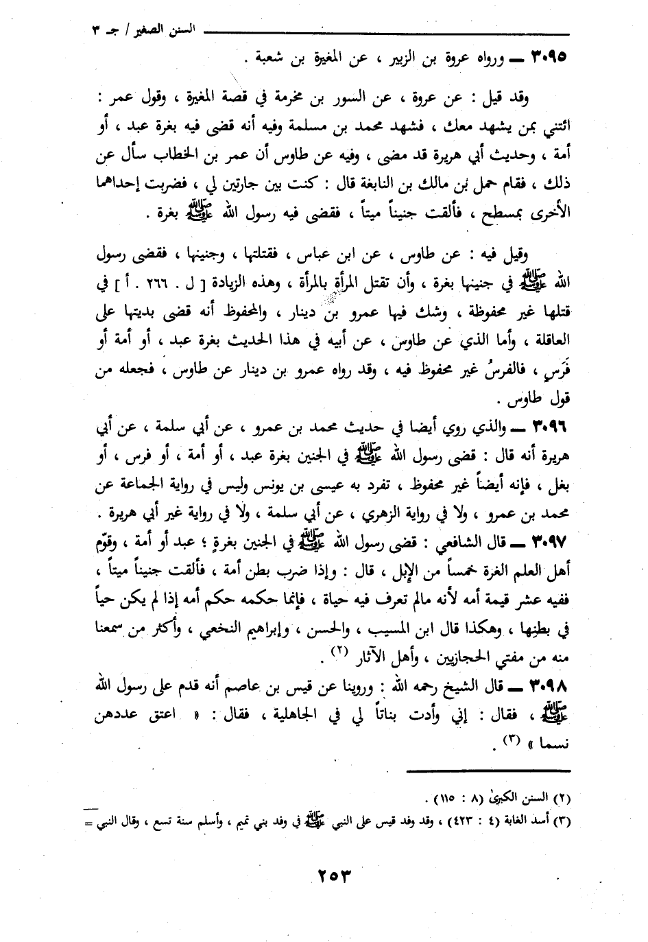 3095 - وَقَدْ قِيلَ: عَنْ عُرْوَةَ، عَنِ الْمِسْوَرِ بْنِ مَخْرَمَةَ، فِي قِصَّةِ الْمُغِيرَةِ، وَقَوْلُ عُمَرَ: " §ائْتِنِي بِمَنْ يَشْهَدُ مَعَكَ، فَشَهِدَ مُحَمَّدُ بْنُ مَسْلَمَةَ وَفِيهِ أَنَّهُ قَضَى فِيهِ بِغُرَّةٍ عَبْدٍ، أَوْ أَمَةٍ، وَحَدِيثُ أَبِي هُرَيْرَةَ قَدْ مَضَى، وَفِيهِ عَنْ طَاوُسٍ، أَنَّ عُمَرَ بْنَ الْخَطَّابِ سَأَلَ عَنْ ذَلِكَ، فَقَامَ حَمَلُ بْنُ مَالِكِ بْنِ النَّابِغَةِ قَالَ: «كُنْتُ بَيْنَ جَارَتَيْنِ لِي، فَضَرَبَتْ إِحْدَاهُمَا الْأُخْرَى بِمِسْطَحٍ، فَأَلْقَتْ جَنِينًا مَيِّتًا، فَقَضَى فِيهِ رَسُولُ اللَّهِ صَلَّى اللهُ عَلَيْهِ وَسَلَّمَ بِغُرَّةٍ»