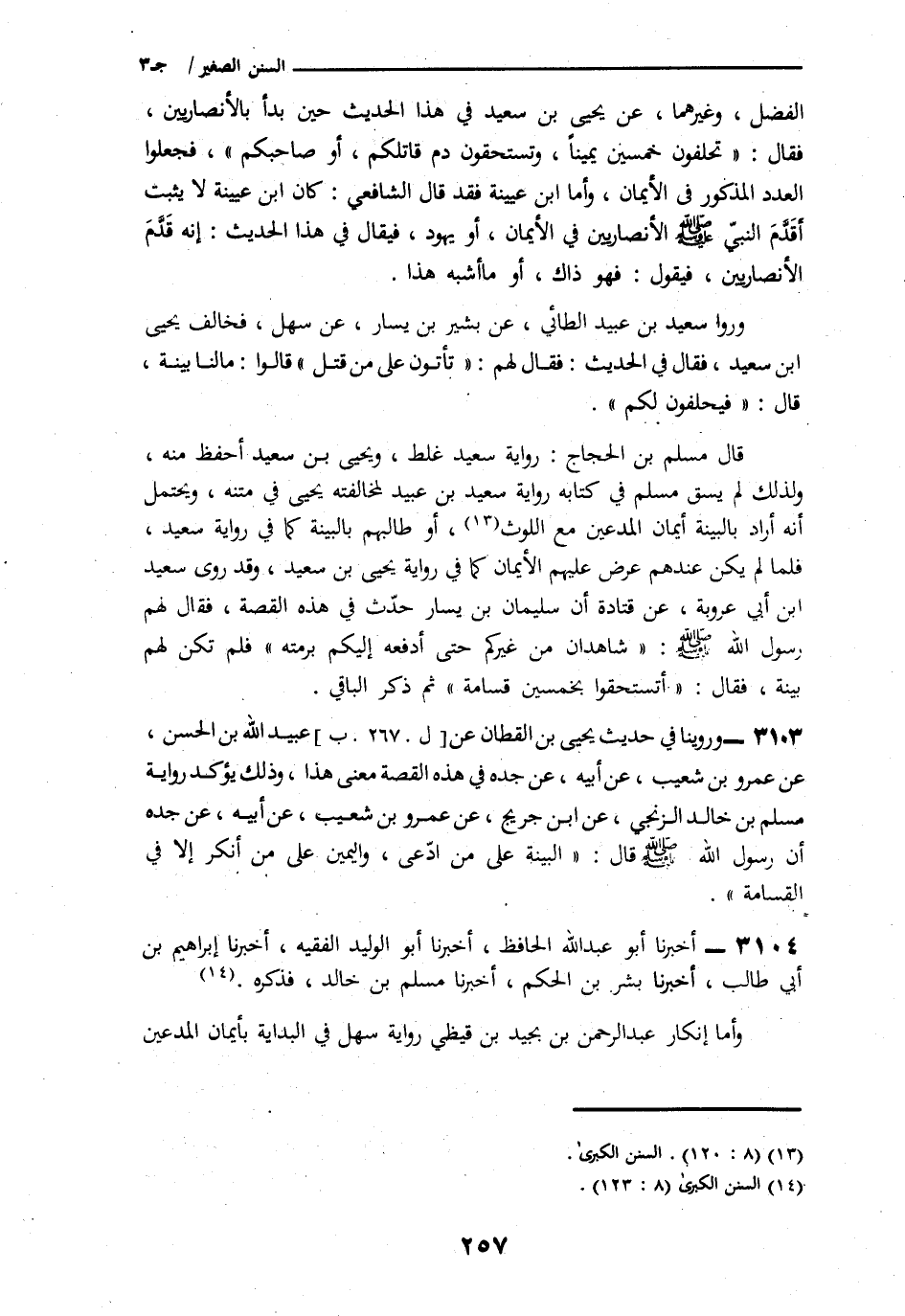 3103 - وَرُوِّينَا فِي حَدِيثِ يَحْيَى بْنِ الْقَطَّانِ، عَنْ عُبَيْدِ اللَّهِ بْنِ الْحَسَنِ، عَنْ عَمْرِو بْنِ شُعَيْبٍ، عَنْ أَبِيهِ، عَنْ جَدِّهِ، فِي هَذِهِ الْقِصَّةِ مَعْنَى هَذَا، وَذَلِكَ يُؤَكِّدُ رِوَايَةَ مُسْلِمِ بْنِ خَالِدٍ الزَّنْجِيَّ، عَنِ ابْنِ جُرَيْجٍ، عَنْ عَمْرِو بْنِ شُعَيْبٍ، عَنْ أَبِيهِ، عَنْ جَدِّهِ، أَنَّ رَسُولَ اللَّهِ صَلَّى اللهُ عَلَيْهِ وَسَلَّمَ قَالَ: «§الْبَيِّنَةُ عَلَى مَنِ ادَّعَى، وَالْيَمِينُ عَلَى مَنْ أَنْكَرَ إِلَّا فِي الْقَسَامَةِ»
