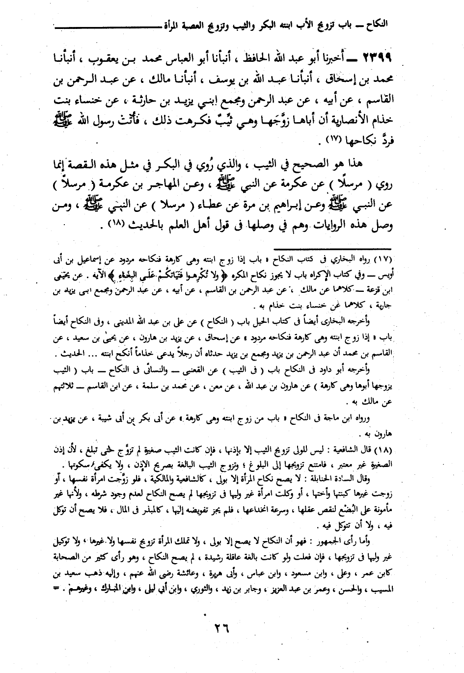 2399 - أَخْبَرَنَا أَبُو عَبْدِ اللَّهِ الْحَافِظُ، ثنا أَبُو الْعَبَّاسِ مُحَمَّدُ بْنُ يَعْقُوبَ، ثنا مُحَمَّدُ بْنُ إِسْحَاقَ، ثنا عَبْدُ اللَّهِ بْنُ يُوسُفَ، ثنا مَالِكٌ، عَنْ عَبْدِ الرَّحْمَنِ بْنِ الْقَاسِمِ، عَنْ أَبِيهِ، عَنْ عَبْدِ الرَّحْمَنِ، وَمُجَمِّعٍ ابْنَيْ يَزِيدَ بْنِ جَارِيَةَ، عَنْ خَنْسَاءَ بِنْتِ خِذَامٍ الْأَنْصَارِيَّةِ،: «§أَنَّ أَبَاهَا زَوَّجَهَا وَهِيَ ثَيِّبٌ، فَكَرِهَتْ ذَلِكَ، فَأَتَتْ رَسُولَ اللَّهِ صَلَّى اللهُ عَلَيْهِ وَسَلَّمَ فَرَدَّ نِكَاحَهَا» هَذَا هُوَ الصَّحِيحُ فِي الثَّيِّبِ، وَالَّذِي رُوِيَ فِي الْبِكْرِ فِي مِثْلِ هَذِهِ الْقِصَّةِ إِنَّمَا رُوِيَ مُرْسَلًا عَنْ عِكْرِمَةَ عَنِ النَّبِيِّ صَلَّى اللهُ عَلَيْهِ وَسَلَّمَ، وَعَنِ الْمُهَاجِرِ بْنِ عِكْرِمَةَ مُرْسَلًا عَنِ النَّبِيِّ صَلَّى اللهُ عَلَيْهِ وَسَلَّمَ وَعَنْ إِبْرَاهِيمَ بْنِ مُرَّةَ، عَنْ عَطَاءٍ، مُرْسَلًا عَنِ النَّبِيِّ صَلَّى اللهُ عَلَيْهِ وَسَلَّمَ. وَمَنْ وَصَلَ هَذِهِ الرِّوَايَاتِ وَهِمَ فِي وَصْلِهَا فِي قَوْلِ أَهْلِ الْعِلْمِ بِالْحَدِيثِ