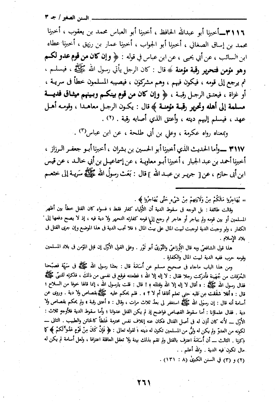 3116 - أَخْبَرَنَا أَبُو عَبْدِ اللَّهِ الْحَافِظُ، نا أَبُو الْعَبَّاسِ مُحَمَّدُ بْنُ يَعْقُوبَ، نا مُحَمَّدُ بْنُ إِسْحَاقَ الصَّغَانِيُّ، نا أَبُو الْجَوَّابِ، نا عَمَّارُ بْنُ رُزَيْقٍ، نا عَطَاءُ بْنُ السَّائِبِ، عَنْ أَبِي يَحْيَى: عَنِ ابْنِ عَبَّاسٍ، فِي قَوْلِهِ تَعَالَى: " {§فَإِنْ كَانَ مِنْ قَوْمٍ عَدُوٍّ لَكُمْ وَهُوَ مُؤْمِنٌ فَتَحْرِيرُ رَقَبَةٍ مُؤْمِنَةٍ} [النساء: 92] قَالَ: كَانَ الرَّجُلُ يَأْتِي رَسُولَ اللَّهِ صَلَّى اللهُ عَلَيْهِ وَسَلَّمَ، فَيُسْلِمُ، ثُمَّ يَرْجِعُ إِلَى قَوْمِهِ، فَيَكُونُ فِيهِمْ، وَهُمْ مُشْرِكُونَ، فَيُصِيبُهُ الْمُسْلِمُونَ خَطَأً فِي سَرِيَّةٍ، أَوْ غَزَاةٍ، فَيُعْتِقُ الرَّجُلُ رَقَبَةً {وَإِنْ كَانَ مِنْ قَوْمٍ بَيْنَكُمْ وَبَيْنَهُمْ مِيثَاقٌ فَدِيَةٌ مُسَلَّمَةٌ إِلَى أَهْلِهِ وَتَحْرِيرُ رَقَبَةٍ مُؤْمِنَةٍ} [النساء: 92] قَالَ: يَكُونُ الرَّجُلُ مُعَاهَدًا، وَقَوْمُهُ أَهْلُ عَهْدٍ، فَيُسَلِّمُ إِلَيْهِمْ دِيَتَهُ، وَأَعْتَقَ الَّذِي أَصَابَهُ رَقَبَةً " وَبِمَعْنَاهُ رَوَاهُ عِكْرِمَةُ، وَعَلِيُّ بْنُ أَبِي طَلْحَةَ، عَنِ ابْنِ عَبَّاسٍ
