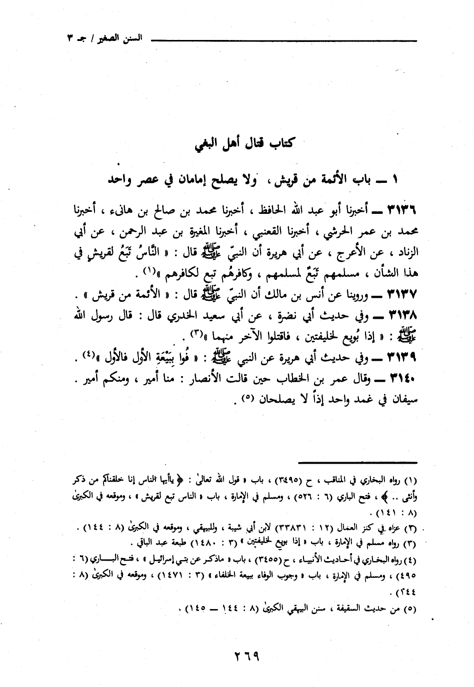 3137 - وَرُوِّينَا عَنْ أَنَسِ بْنِ مَالِكٍ، أَنَّ النَّبِيَّ صَلَّى اللهُ عَلَيْهِ وَسَلَّمَ قَالَ: § «الْأَئِمَّةُ مِنْ قُرَيْشٍ»