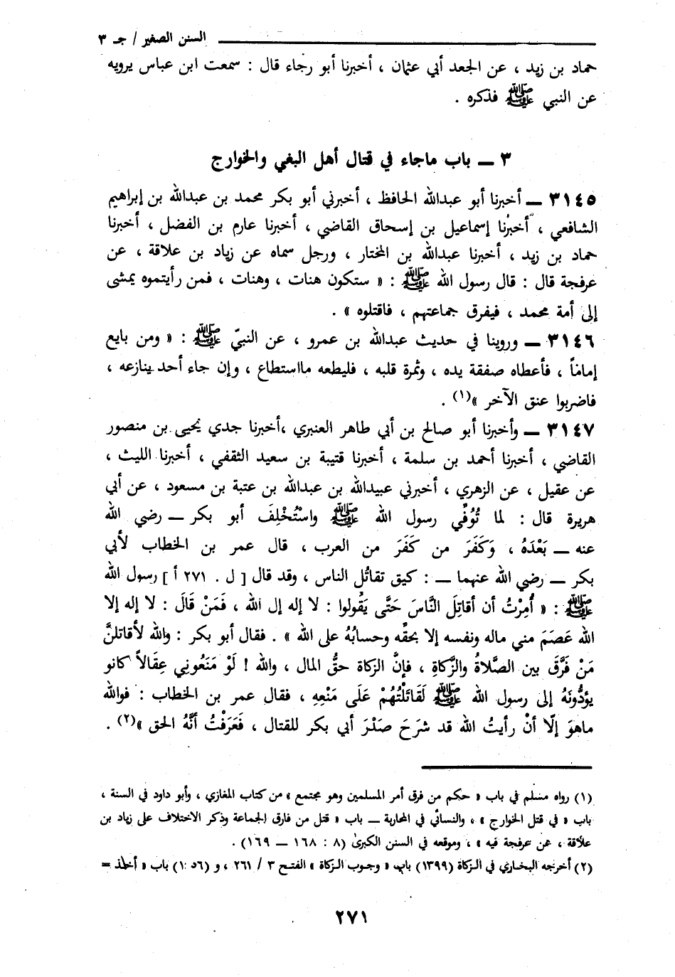 3147 - وَأَخْبَرَنَا أَبُو صَالِحِ بْنُ أَبِي طَاهِرٍ الْعَنْبَرِيُّ، نا جَدِّي يَحْيَى بْنُ مَنْصُورٍ الْقَاضِي، نا أَحْمَدُ بْنُ سَلَمَةَ، نا قُتَيْبَةُ بْنُ سَعِيدٍ الثَّقَفِيُّ، نا اللَّيْثُ، عَنْ عَقِيلٍ، عَنِ الزُّهْرِيِّ، أَخْبَرَنِي عُبَيْدُ اللَّهِ بْنُ عَبْدِ اللَّهِ بْنِ عُتْبَةَ بْنِ مَسْعُودٍ، عَنْ أَبِي هُرَيْرَةَ، قَالَ: لَمَّا تُوُفِّيَ رَسُولُ اللَّهِ صَلَّى اللهُ عَلَيْهِ وَسَلَّمَ وَاسْتُخْلِفَ أَبُو بَكْرٍ رَضِيَ اللَّهُ عَنْهُ بَعْدَهُ، وَكَفَرَ مَنْ كَفَرَ مِنَ الْعَرَبِ قَالَ عُمَرُ بْنُ الْخَطَّابِ: لِأَبِي بَكْرٍ رَضِيَ اللَّهُ عَنْهُمَا: كَيْفَ تُقَاتِلُ النَّاسَ، وَقَدْ قَالَ رَسُولُ اللَّهِ صَلَّى اللهُ عَلَيْهِ وَسَلَّمَ: " §أُمِرْتُ أَنْ أُقَاتِلَ النَّاسَ حَتَّى يَقُولُوا: لَا إِلَهَ إِلَّا اللَّهُ، فَمَنْ قَالَ: لَا إِلَهَ إِلَّا اللَّهُ عَصَمَ مِنِّي مَالَهُ وَنَفْسَهُ إِلَّا بِحَقِّهِ وَحِسَابُهُ عَلَى اللَّهِ " فَقَالَ أَبُو بَكْرٍ: وَاللَّهِ لَأُقَاتِلَنَّ مَنْ فَرَّقَ بَيْنَ الصَّلَاةِ وَالزَّكَاةِ، فَإِنَّ الزَّكَاةَ حَقُّ الْمَالِ، وَاللَّهِ لَوْ مَنَعُونِي عِقَالًا كَانُوا يُؤَدُّونَهُ إِلَى رَسُولِ اللَّهِ صَلَّى اللهُ عَلَيْهِ وَسَلَّمَ لَقَاتَلْتُهُمْ عَلَى مَنْعِهِ، فَقَالَ عُمَرُ بْنُ الْخَطَّابِ: فَوَاللَّهِ مَا هُوَ إِلَّا أَنْ رَأَيْتُ اللَّهَ قَدْ شَرَحَ صَدْرَ أَبِي بَكْرٍ لِلْقِتَالِ، فَعَرَفْتُ أَنَّهُ الْحَقُّ