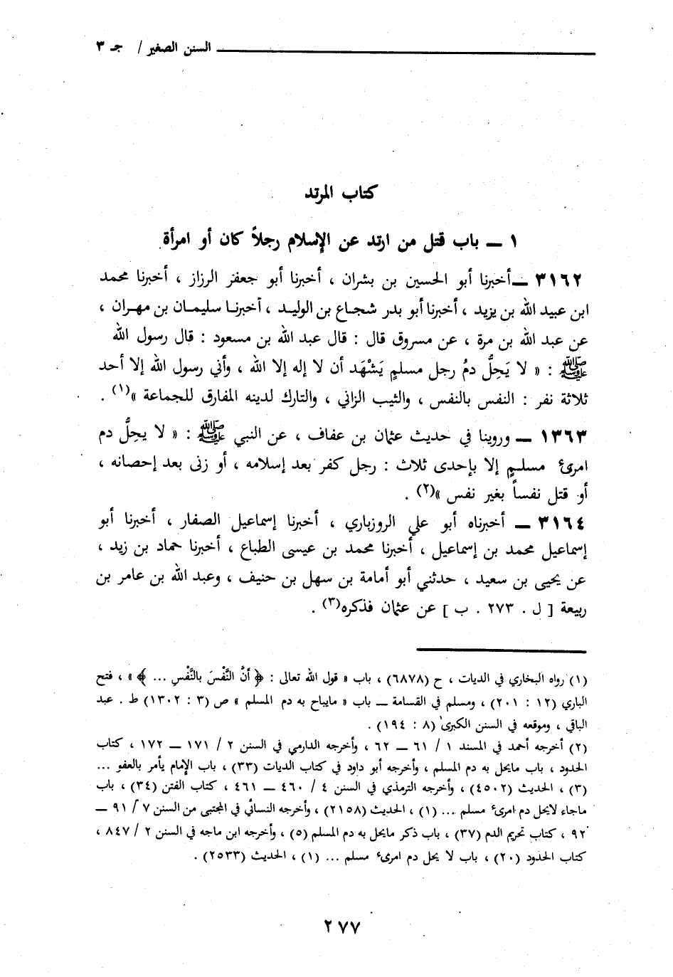 3163 - وَرُوِّينَا فِي حَدِيثِ عُثْمَانَ بْنِ عَفَّانَ، عَنِ النَّبِيِّ صَلَّى اللهُ عَلَيْهِ وَسَلَّمَ: " §لَا يَحِلُّ دَمُ امْرِئٍ مُسْلِمٍ إِلَّا بِإِحْدَى ثَلَاثٍ: رَجُلٌ كَفَرَ بَعْدَ إِسْلَامِهِ، أَوْ زَنَى بَعْدَ إِحْصَانِهِ، أَوْ قَتَلَ نَفْسًا بِغَيْرِ نَفْسٍ "