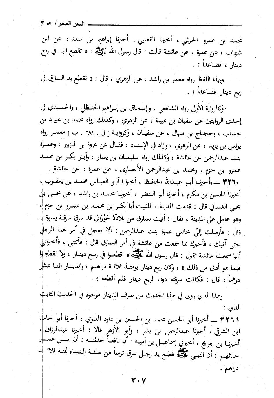 2607 - أَخْبَرَنَا أَبُو الْحَسَنِ مُحَمَّدُ بْنُ الْحُسَيْنِ بْنِ دَاوُدَ الْعَلَوِيُّ، نا أَبُو حَامِدِ بْنُ الشَّرْقِيُّ، نا عَبْدُ الرَّحْمَنِ بْنُ بِشْرٍ، وَأَبُو الْأَزْهَرِ، قَالَا: نا عَبْدُ الرَّزَّاقِ، نا ابْنُ جُرَيْجٍ، أَخْبَرَنِي إِسْمَاعِيلُ بْنُ أُمَيَّةَ،: أَنَّ نَافِعًا، حَدَّثَهُ: أَنَّ ابْنَ عُمَرَ حَدَّثَهُمْ: § «أَنَّ النَّبِيَّ صَلَّى اللهُ عَلَيْهِ وَسَلَّمَ قَطَعَ يَدَ رَجُلٍ سَرَقَ تُرْسًا مِنْ صِفَةِ النِّسَاءِ ثَمَنُهُ ثَلَاثَةُ دَرَاهِمَ» -[308]- وَبِمَعْنَاهُ رَوَاهُ مَالِكُ بْنُ أَنَسٍ، وَمُوسَى بْنُ عُقْبَةَ، وَعُبَيْدُ اللَّهِ بْنُ عُمَرَ، وَأَيُّوبُ السَّخْتِيَانِيُّ، وَغَيْرُهُمْ، عَنْ نَافِعٍ، وَقَالَ بَعْضُهُمْ: وَثَمَنُهُ ثَلَاثَةُ دَرَاهِمَ