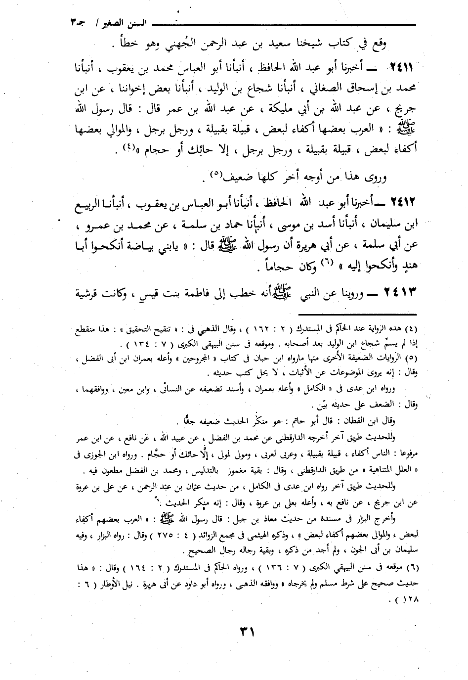 2411 - أَخْبَرَنَا أَبُو عَبْدِ اللَّهِ الْحَافِظُ، ثنا أَبُو الْعَبَّاسِ مُحَمَّدُ بْنُ يَعْقُوبَ، ثَنَا مُحَمَّدُ بْنُ إِسْحَاقَ الصَّغَانِيُّ، ثنا شُجَاعُ بْنُ الْوَلِيدِ، ثنا بَعْضُ إِخْوَانِنَا، عَنِ ابْنِ جُرَيْجٍ، عَنْ عَبْدِ اللَّهِ بْنِ أَبِي مُلَيْكَةَ، عَنْ عَبْدِ اللَّهِ بْنِ عُمَرَ، قَالَ: قَالَ رَسُولُ اللَّهِ صَلَّى اللهُ عَلَيْهِ وَسَلَّمَ: «§الْعَرَبُ بَعْضُهُمْ أَكْفَاءٌ لِبَعْضٍ، قَبِيلَةٌ بِقَبِيلَةٍ، وَرَجُلٌ بِرَجُلٍ، وَالْمَوَالِي بَعْضُهُمْ أَكْفَاءٌ لِبَعْضٍ، قَبِيلَةٌ بِقَبِيلَةٍ، وَرَجُلٌ بِرَجُلٍ، إِلَّا حَائِكٌ أَوْ حَجَّامٌ»