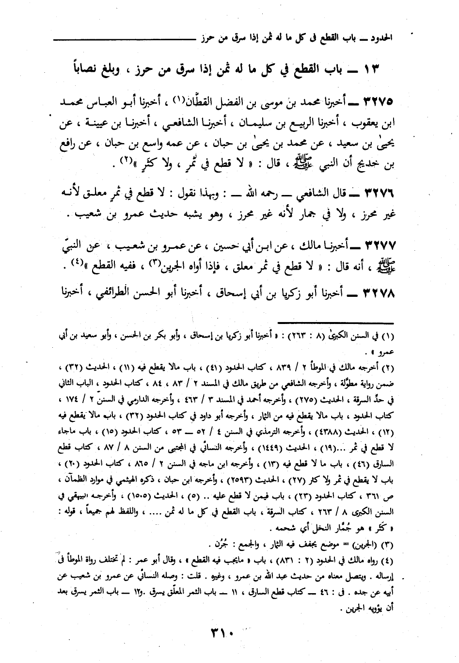 2614 - أَخْبَرَنَا مُحَمَّدُ بْنُ مُوسَى بْنِ الْفَضْلِ الْقَطَّانُ، نا أَبُو الْعَبَّاسِ مُحَمَّدُ بْنُ يَعْقُوبَ، نا الرَّبِيعُ بْنُ سُلَيْمَانَ، نا الشَّافِعِيُّ، نا ابْنُ عُيَيْنَةَ، عَنْ يَحْيَى بْنِ سَعِيدٍ، عَنْ مُحَمَّدِ بْنِ يَحْيَى بْنِ حِبَّانَ، عَنْ عَمِّهِ، وَاسِعِ بْنِ حِبَّانَ، عَنْ رَافِعِ بْنِ خَدِيجٍ، أَنَّ النَّبِيَّ صَلَّى اللهُ عَلَيْهِ وَسَلَّمَ قَالَ: «§لَا قَطْعَ فِي ثَمَرٍ، وَلَا كَثَرٍ» قَالَ الشَّافِعِيُّ رَحِمَهُ اللَّهُ: وَبِهَذَا نَقُولُ: لَا قَطْعَ فِي ثَمَرٍ مُعَلَّقٍ وَلَا غَيْرِ مُحَرَّزٍ، وَلَا فِي جُمَّارٍ لِأَنَّهُ غَيْرُ مُحَرَّزٍ، وَهُوَ يُشْبِهُ حَدِيثَ عَمْرِو بْنِ شُعَيْبٍ