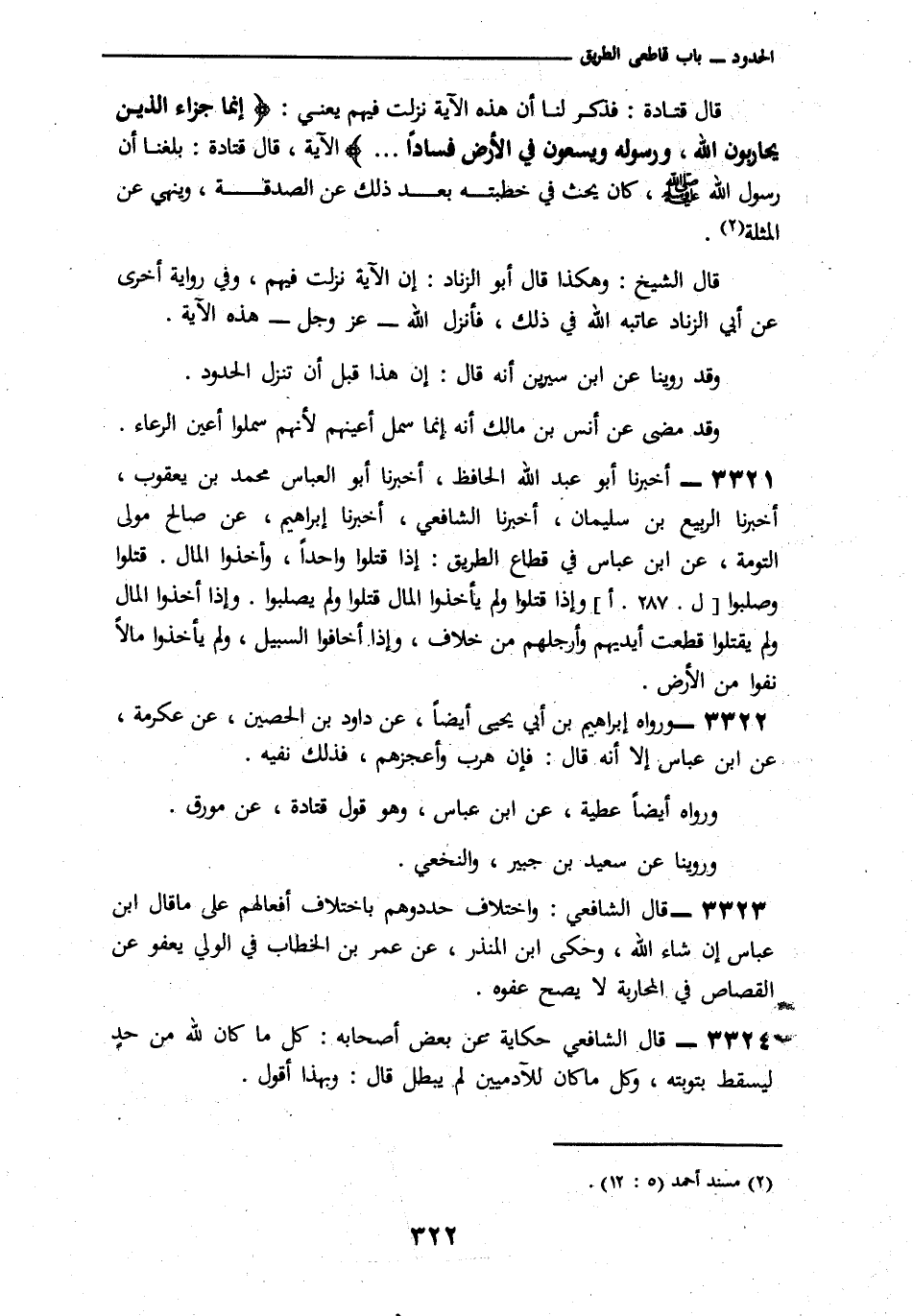 2650 - قَالَ قَتَادَةُ: فَذُكِرَ لَنَا أَنَّ هَذِهِ الْآيَةَ نَزَلَتْ فِيهِمْ يَعْنِي: {إِنَّمَا جَزَاءُ الَّذِينَ يُحَارِبُونَ اللَّهَ، وَرَسُولَهُ وَيَسْعَوْنَ فِي الْأَرْضِ فَسَادًا} [المائدة: 33] الْآيَةُ قَالَ قَتَادَةُ: بَلَغَنَا أَنَّ رَسُولَ اللَّهِ صَلَّى اللهُ عَلَيْهِ وَسَلَّمَ، كَانَ §يَحُثُّ فِي خُطْبَتِهِ بَعْدَ ذَلِكَ عَلَى الصَّدَقَةِ، وَيَنْهَى عَنِ الْمُثْلَةَ "، قَالَ الشَّيْخُ: وَهَكَذَا قَالَ أَبُو الزِّنَادِ: إِنَّ الْآيَةَ نَزَلَتْ فِيهِمْ، وَفِي رِوَايَةٍ أُخْرَى عَنْ أَبِي الزِّنَادِ عَاتَبَهُ اللَّهُ فِي ذَلِكَ، فَأَنْزَلَ اللَّهُ عَزَّ وَجَلَّ هَذِهِ الْآيَةَ وَقَدْ رُوِّينَا عَنِ ابْنِ سِيرِينَ، أَنَّهُ قَالَ: إِنَّ هَذَا قَبْلَ أَنْ تَنْزِلَ الْحُدُودُ وَقَدْ مَضَى عَنْ أَنَسِ بْنِ مَالِكٍ أَنَّهُ إِنَّمَا سَمَلَ أَعْيُنَهُمْ لِأَنَّهُمْ سَمَلُوا أَعْيُنَ الرِّعَاءِ