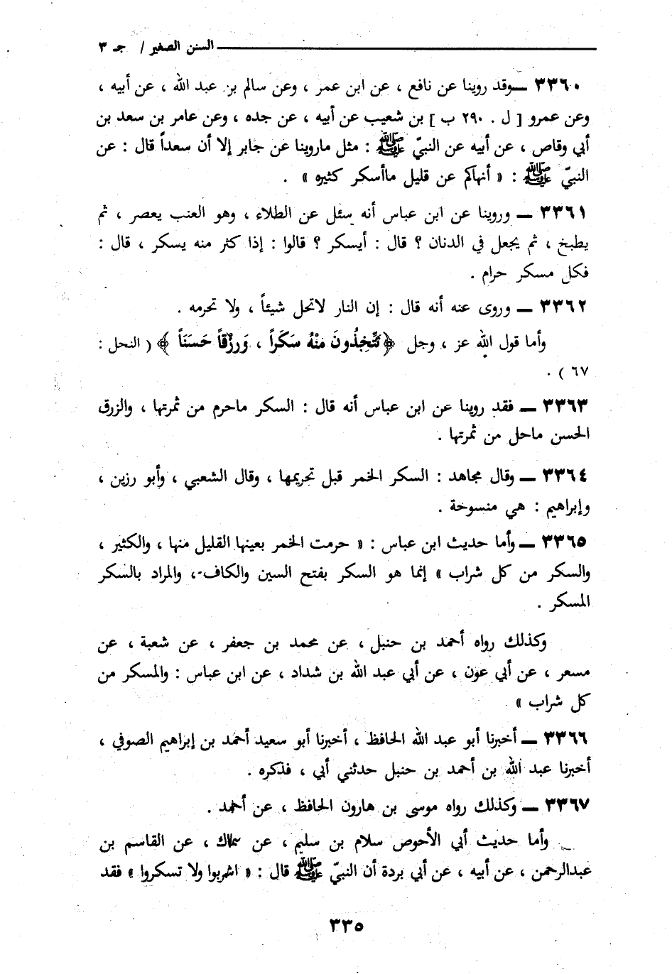 2682 - وَقَدْ رُوِّينَا عَنْ نَافِعٍ، عَنِ ابْنِ عُمَرَ، وَعَنْ سَالِمِ بْنِ عَبْدِ اللَّهِ، عَنْ أَبِيهِ، وَعَنْ عَمْرِو بْنِ شُعَيْبٍ، عَنْ أَبِيهِ، عَنْ جَدِّهِ، وَعَنْ عَامِرِ بْنِ سَعْدِ بْنِ أَبِي وَقَّاصٍ، عَنْ أَبِيهِ، عَنِ النَّبِيِّ صَلَّى اللهُ عَلَيْهِ وَسَلَّمَ مِثْلَ مَا رُوِّينَا عَنْ جَابِرٍ إِلَّا أَنَّ سَعْدًا قَالَ: عَنِ النَّبِيِّ صَلَّى اللهُ عَلَيْهِ وَسَلَّمَ: § «أَنْهَاكُمْ عَنْ قَلِيلِ مَا أَسْكَرَ كَثِيرُهُ»