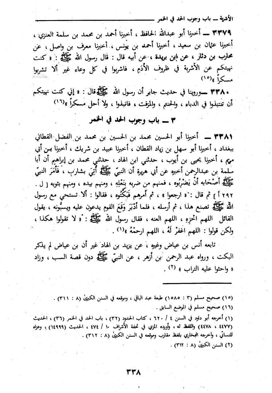 2699 - أَخْبَرَنَا أَبُو الْحُسَيْنِ مُحَمَّدُ بْنُ الْحُسَيْنِ بْنِ مُحَمَّدِ بْنِ الْفَضْلِ الْقَطَّانِيُّ بِبَغْدَادَ، نا أَبُو سَهْلِ بْنُ زِيَادٍ الْقَطَّانُ، نا عُبَيْدُ بْنُ شَرِيكٍ، نا ابْنُ أَبِي مَرْيَمَ، نا يَحْيَى بْنُ أَيُّوبَ، حَدَّثَنِي ابْنُ الْهَادِ، حَدَّثَنِي مُحَمَّدُ بْنُ إِبْرَاهِيمَ، أَنَّ أَبَا سَلَمَةَ بْنَ عَبْدِ الرَّحْمَنِ، أَخْبَرَهُ عَنْ أَبِي هُرَيْرَةَ، أَنَّ النَّبِيَّ صَلَّى اللهُ عَلَيْهِ وَسَلَّمَ أُتِيَ بِشَارِبٍ، فَأَمَرَ النَّبِيُّ صَلَّى اللهُ عَلَيْهِ وَسَلَّمَ أَصْحَابَهُ أَنْ يَضْرِبُوهُ، فَمِنْهُمْ مَنْ ضَرَبَهُ بِنَعْلِهِ، وَمِنْهُمْ بِيَدِهِ، وَمِنْهُمْ بِثَوْبِهِ ثُمَّ قَالَ: «ارْجِعُوا»، ثُمَّ أَمَرَهُمْ فَبَكَّتُوهُ، فَقَالُوا: أَلَا تَسْتَحِي مَعَ رَسُولِ اللَّهِ صَلَّى اللهُ عَلَيْهِ وَسَلَّمَ تَصْنَعُ هَذَا؟ ثُمَّ أَرْسَلَهُ، فَلَمَّا أَدْبَرَ وَقَعَ الْقَوْمُ يَدْعُونَ عَلَيْهِ وَيَسُبُّونَهُ يَقُولُ الْقَائِلُ اللَّهُمَّ أَخْزِهِ، اللَّهُمَّ الْعَنْهُ، فَقَالَ رَسُولُ اللَّهِ صَلَّى اللهُ عَلَيْهِ وَسَلَّمَ: " §لَا تَقُولُوا هَذَا، وَلَكِنْ قُولُوا: اللَّهُمَّ اغْفِرْ لَهُ، اللَّهُمَّ ارْحَمْهُ «تَابَعَهُ أَنَسُ بْنُ عِيَاضٍ وَغَيْرُهُ، عَنْ يَزِيدَ بْنِ الْهَادِ غَيْرَ أَنَّ ابْنَ عِيَاش لَمْ يَذْكُرِ الْبَكَتَ. وَرَوَاهُ عَبْدُ الرَّحْمَنِ بْنُ أَزْهَرَ، عَنِ النَّبِيِّ صَلَّى اللهُ عَلَيْهِ وَسَلَّمَ دُونَ قِصَّةِ السَّبِّ، وَزَادَ» وَاحْثُوا عَلَيْهِ التُّرَابَ " -[339]-. وَفِي بَعْضِ الرِّوَايَاتِ عَنْهُ: فَحَثَى فِي وَجْهِهِ التُّرَابَ. وَفِي بَعْضِهَا: فَحَثَى عَلَيْهِ النَّبِيُّ صَلَّى اللهُ عَلَيْهِ وَسَلَّمَ التُّرَابَ