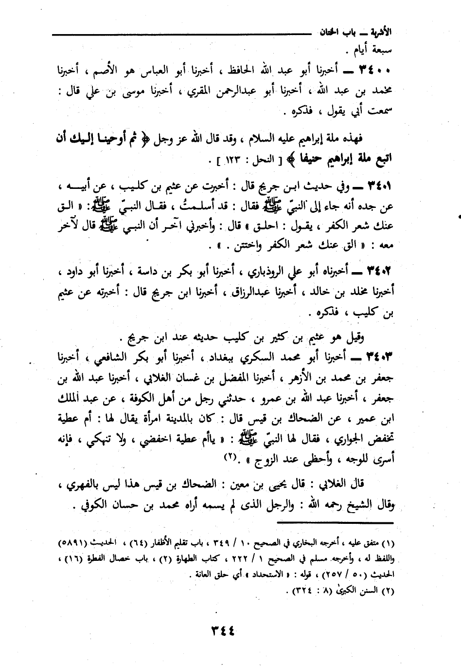 2714 - أَخْبَرَنَا أَبُو عَبْدِ اللَّهِ الْحَافِظُ، نا أَبُو الْعَبَّاسِ هُوَ الْأَصَمُّ، نا مُحَمَّدُ بْنُ عُبَيْدِ اللَّهِ، نا أَبُو عَبْدِ الرَّحْمَنِ الْمُقْرِي، نا مُوسَى بْنُ عَلِيٍّ، قَالَ: سَمِعْتُ أَبِي يَقُولُ، فَذَكَرَهُ. فَهَذِهِ مِلَّةُ إِبْرَاهِيمَ عَلَيْهِ السَّلَامُ، وَقَدْ قَالَ اللَّهُ عَزَّ وَجَلَّ: {ثُمَّ أَوْحَيْنَا إِلَيْكَ أَنِ اتَّبِعْ مِلَّةَ إِبْرَاهِيمَ حَنِيفًا} [النحل: 123]. وَفِي حَدِيثِ ابْنِ جُرَيْجٍ قَالَ: أُخْبِرْتُ عَنْ عُثَيْمِ بْنِ كُلَيْبٍ، عَنْ أَبِيهِ، عَنْ جَدِّهِ أَنَّهُ جَاءَ إِلَى النَّبِيِّ صَلَّى اللهُ عَلَيْهِ وَسَلَّمَ فَقَالَ: قَدْ أَسْلَمْتُ، فَقَالَ النَّبِيُّ صَلَّى اللهُ عَلَيْهِ وَسَلَّمَ: " §أَلْقِ عَنْكَ شَعْرَ الْكُفْرِ يَقُولُ: احْلِقْ " قَالَ: وَأَخْبَرَنِي آخَرُ أَنَّ النَّبِيَّ صَلَّى اللهُ عَلَيْهِ وَسَلَّمَ قَالَ لِآخَرَ مَعَهُ: «أَلْقِ عَنْكَ شَعْرَ الْكُفْرِ وَاخْتَتِنْ» أَخْبَرَنَاهُ أَبُو عَلِيٍّ الرُّوذْبَارِيُّ، نا أَبُو بَكْرِ بْنُ دَاسَةَ، نا أَبُو دَاوُدَ، نا مَخْلَدُ بْنُ خَالِدٍ، نا عَبْدُ الرَّزَّاقِ، نا ابْنُ جُرَيْجٍ، قَالَ: أُخْبِرْتُهُ عَنْ عُثَيْمِ بْنِ كُلَيْبٍ، فَذَكَرَهُ. وَقِيلَ: هُوَ عُثَيْمُ بْنُ كَثِيرِ بْنِ كُلَيْبٍ حَدِيثُهُ عِنْدَ ابْنِ جُرَيْجٍ
