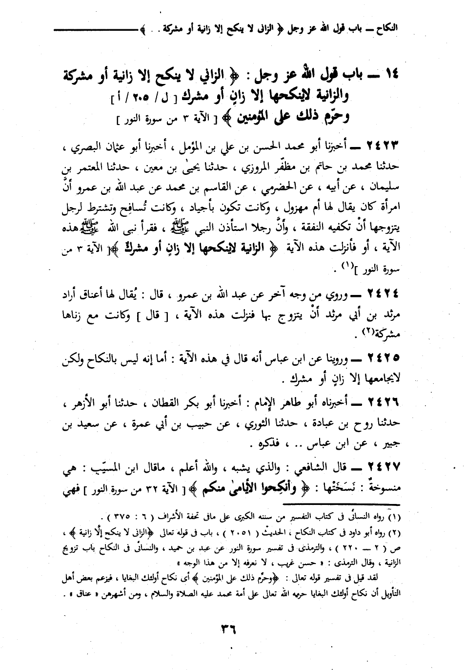 §بَابُ قَوْلِ اللَّهِ عَزَّ وَجَلَّ: {«الزَّانِي لَا يَنْكِحُ إِلَّا زَانِيَةً أَوْ مُشْرِكَةً، وَالزَّانِيَةُ لَا يَنْكِحُهَا إِلَّا زَانٍ أَوْ مُشْرِكٌ، وَحُرِّمَ ذَلِكَ عَلَى الْمُؤْمِنِينَ»} [النور: 3]