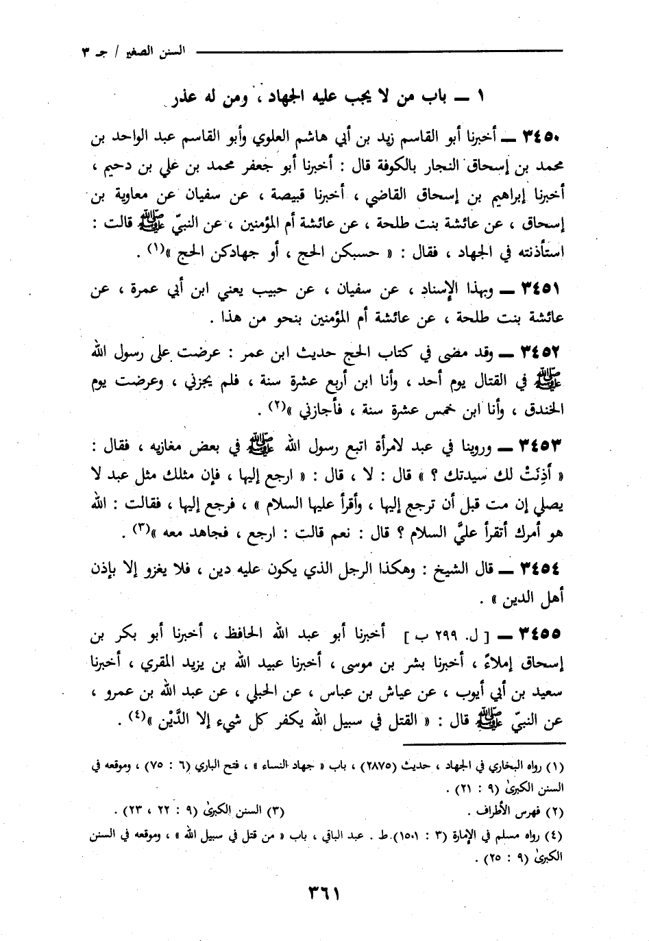2756 - أَخْبَرَنَا أَبُو الْقَاسِمِ زَيْدُ بْنُ أَبِي هَاشِمٍ الْعَلَوِيُّ وَأَبُو الْقَاسِمِ عَبْدُ الْوَاحِدِ بْنُ مُحَمَّدِ بْنِ إِسْحَاقَ النَّجَّارُ بِالْكُوفَةِ قَالَ: نا أَبُو جَعْفَرٍ مُحَمَّدُ بْنُ عَلِيِّ بْنِ دُحَيْمٍ، نا إِبْرَاهِيمُ بْنُ إِسْحَاقَ الْقَاضِي، نا قَبِيصَةُ، عَنْ سُفْيَانَ، عَنْ مُعَاوِيَةَ بْنِ إِسْحَاقَ، عَنْ عَائِشَةَ بِنْتِ طَلْحَةَ، عَنْ عَائِشَةَ أُمِّ الْمُؤْمِنِينَ، عَنِ النَّبِيِّ صَلَّى اللهُ عَلَيْهِ وَسَلَّمَ قَالَتِ: اسْتَأْذَنْتُهُ فِي الْجِهَادِ، فَقَالَ: «§حَسْبُكُنَّ الْحَجُّ، أَوْ جِهَادُكُنَّ الْحَجُّ» وَبِهَذَا الْإِسْنَادِ، عَنْ سُفْيَانَ، عَنْ حَبِيبٍ يَعْنِي ابْنَ أَبِي عَمْرَةَ، عَنْ عَائِشَةَ بِنْتِ طَلْحَةَ، عَنْ عَائِشَةَ أُمِّ الْمُؤْمِنِينَ بِنَحْو مِنْ هَذَا وَقَدْ مَضَى فِي كِتَابِ الْحَجِّ حَدِيثُ ابْنِ عُمَرَ: عُرِضْتُ عَلَى رَسُولِ اللَّهِ صَلَّى اللهُ عَلَيْهِ وَسَلَّمَ فِي الْقِتَالِ يَوْمَ أُحُدٍ، وَأَنَا ابْنُ أَرْبَعَ عَشْرَةَ سَنَةً، فَلَمْ يُجِزْنِي، وَعُرِضْتُ يَوْمَ الْخَنْدَقِ، وَأَنَا ابْنُ خَمْسَ عَشْرَةَ سَنَةً فَأَجَازَنِي وَرُوِّينَا فِي عَبْدٍ لِامْرَأَةٍ، اتَّبَعَ رَسُولَ اللَّهِ صَلَّى اللهُ عَلَيْهِ وَسَلَّمَ فِي بَعْضِ مَغَازِيهِ، فَقَالَ: «أَذِنَتْ لَكَ سَيِّدَتُكَ؟» قَالَ: لَا. قَالَ: «ارْجِعْ إِلَيْهَا، فَإِنَّ مَثَلَكَ مَثَلُ عَبْدٍ لَا يُصَلِّي، إِنْ مُتَّ قَبْلَ أَنْ تَرْجِعَ إِلَيْهَا، وَأَقْرَأْ عَلَيْهَا السَّلَامَ» فَرَجَعَ إِلَيْهَا، فَقَالَتْ: اللَّهِ هُوَ أَمَرَكَ أَنْ تَقْرَأَ عَلَيَّ السَّلَامَ؟ قَالَ: نَعَمْ. قَالَتِ: ارْجِعْ، فَجَاهِدْ مَعَهُ. قَالَ الشَّيْخُ: وَهَكَذَا الرَّجُلُ الَّذِي يَكُونُ عَلَيْهِ دَيْنٌ، فَلَا يَغْزُو إِلَّا بِإِذْنِ أَهْلِ الدَّيْنِ
