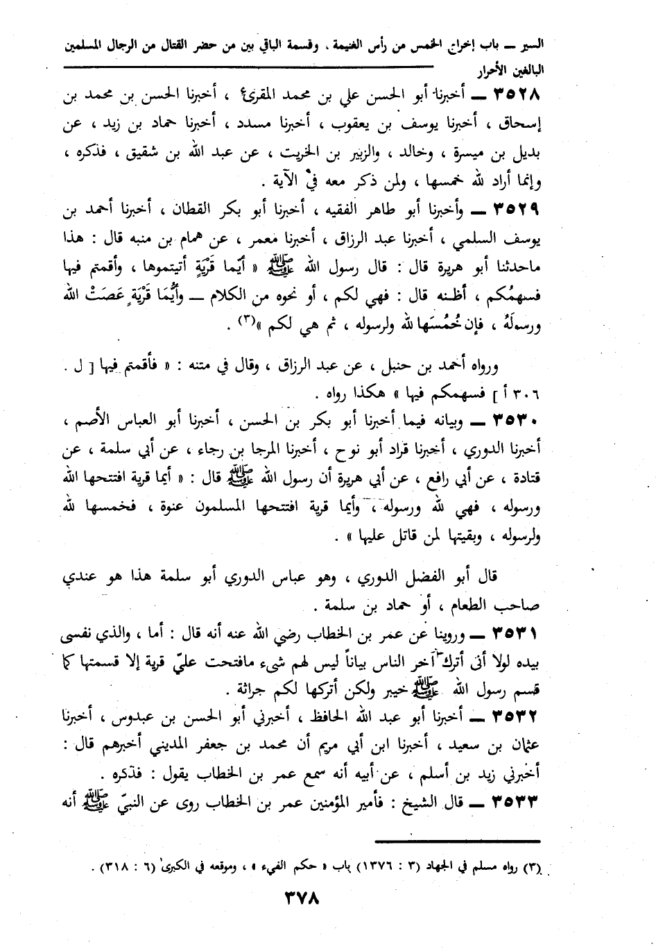 2815 - وَرُوِّينَا عَنْ عُمَرَ بْنِ الْخَطَّابِ رَضِيَ اللَّهُ عَنْهُ أَنَّهُ قَالَ: «أَمَا وَالَّذِي نَفْسِي بِيَدِهِ §لَوْلَا أَنِّي أَتْرُكُ آخِرَ النَّاسِ بَبَانًا لَيْسَ لَهُمْ شَيْءٌ، مَا فُتِحَتْ عَلَيَّ قَرْيَةٌ إِلَّا قَسَمْتُهَا كَمَا قَسَمَ رَسُولُ اللَّهِ صَلَّى اللهُ عَلَيْهِ وَسَلَّمَ خَيْبَرَ، وَلَكِنْ أَتْرُكُهَا لَكُمْ خَزَانَةً» أَخْبَرَنَا أَبُو عَبْدِ اللَّهِ الْحَافِظُ، أَخْبَرَنِي أَبُو الْحَسَنِ بْنُ عَبْدُوسَ، نا عُثْمَانُ بْنُ سَعِيدٍ، نا ابْنُ أَبِي مَرْيَمَ، أَنَّ مُحَمَّدَ بْنَ جَعْفَرٍ الْمَدِينِيَّ، أَخْبَرَهُمْ قَالَ: أَخْبَرَنِي زَيْدُ بْنُ أَسْلَمَ، عَنْ أَبِيهِ، أَنَّهُ سَمِعَ عُمَرَ بْنَ الْخَطَّابِ، يَقُولُ فَذَكَرَهُ. قَالَ الشَّيْخُ: فَأَمِيرُ الْمُؤْمِنِينَ عُمَرُ بْنُ الْخَطَّابِ رَوَى عَنِ النَّبِيِّ صَلَّى اللهُ عَلَيْهِ وَسَلَّمَ أَنَّهُ -[379]- قَسَمَ خَيْبَرَ يَعْنِي مَتَاعَهَا، وَحِيطَانَهَا كَمَا رُوِيَ عَنْ أَبِي هُرَيْرَةَ أَنَّهُ قَالَ: افْتَتَحْنَا خَيْبَرَ، فَلَمْ نَغْنَمْ ذَهَبًا، وَلَا فِضَّةً إِنَّمَا غَنِمْنَا الْإِبِلَ، وَالْبَقَرَ، وَالْحَوَائِطَ يَعْنِي مَا فَتَحُوهُ عَنْوَةً، فَقَدْ كَانَ بَعْضُهَا صُلْحًا، وَمَا لَمْ يُفْتَحْ عَنْوَةً لَا يَكُونُ بَيْنَ الْغَانِمِينَ. وَلِذَلِكَ قَالَ سَهْلُ بْنُ أَبِي حَثَمَةَ قَسَمَ رَسُولُ اللَّهِ صَلَّى اللهُ عَلَيْهِ وَسَلَّمَ خَيْبَرَ نِصْفَينِ: نِصْفًا لَنَوَائِبِهِ وَحَاجَتِهِ، وَنِصْفًا بَيْنَ الْمُسْلِمِينَ، فَقَسَمَهَا بَيْنَهُمْ عَلَى ثَمَانِيَةَ عَشَرَ سَهْمًا، ثُمَّ إِنَّ أَمِيرَ الْمُؤْمِنِينَ عُمَرَ حِينَ افْتَتَحَ الْعِرَاقَ، وَقُسِمَتْ أَرَاضِيهَا بَيْنَ الْغَانِمِينَ رَأَى مِنَ الْمَصْلَحَةِ أَنْ يَسْتَطِيبَ أَنْفُسَ الْغَانِمِينَ حَتَّى يَرُدُّوهَا عَلَى بَيْتِ الْمَالِ، ثُمَّ يَدْفَعُهَا لِلْمُسْلِمِينَ لِتَكُونَ مَنَافَعَهَا لَهُمْ، وَلِمَنْ بَعْدَهُمْ مِنَ الْمُسْلِمِينَ بِالْخَرَاجِ الَّذِي يَضَعُهُ عَلَيْهَا، وَهُوَ كَمَا قَسَمَ رَسُولُ اللَّهِ صَلَّى اللهُ عَلَيْهِ وَسَلَّمَ سَبْيَ هَوَازِنَ، ثُمَّ اسْتَطَابَ أَنْفُسَ الْغَانِمِينَ حَتَّى رَدُّوا السَّبَايَا عَلَى أَهْلِهَا وَاحْتَجَّ الشَّافِعِيُّ بِمَا أَخْبَرَنَا أَبُو سَعِيدِ بْنُ أَبِي عَمْرٍو، نا أَبُو الْعَبَّاسِ الْأَصَمُّ، نا الرَّبِيعُ، نا الشَّافِعِيُّ، نا الثِّقَةُ، عَنْ إِسْمَاعِيلَ بْنِ أَبِي خَالِدٍ، عَنْ قَيْسِ بْنِ أَبِي حَازِمٍ، عَنْ جَرِيرِ بْنِ عَبْدِ اللَّهِ قَالَ: كَانَتْ بَجِيلَةُ رُبْعَ النَّاسِ، فَقَسَمَ لَهُمْ رُبْعَ السَّوَادِ، فَاسْتَغَلُّوهُ ثَلَاثًا، أَوْ أَرْبَعَ سِنِينَ، ثُمَّ قَدِمْتُ عَلَى عُمَرَ بْنِ الْخَطَّابِ، وَمَعِي فُلَانَةُ بِنْتُ فُلَانٍ امْرَأَةٌ مِنْهُمْ سَمَّاهَا غَيْرُ الشَّافِعِيِّ أُمَّ كُرْزٍ، فَقَالَ عُمَرُ بْنُ الْخَطَّابِ: لَوْلَا أَنِّي قَاسِمٌ مَسْئُولٌ لَتُرِكْتُمْ عَلَى مَا قُسِمَ لَكُمْ، وَلَكِنِّي أَرَى أَنْ تَرُدُّوا عَلَى النَّاسِ قَالَ الشَّافِعِيُّ: وَكَانَ فِي حَدِيثِهِ: وَعَاضَنِي مِنْ حَقِّي فِيهِ نَيِّفًا، وَثَمَانِينَ دِينَارًا. وَفِي رِوَايَةِ غَيْرِ الشَّافِعِيِّ، ثَمَانِينَ دِينَارًا، وَقَالَتْ فُلَانَةُ: شَهِدَ أَبِي الْقَادِسِيَّةَ وَثَبَتَ سَهْمُهُ، وَلَا أُسْلِمُهُ حَتَّى تُعْطِيَنِي كَذَا، وَتُعْطِيَنِي كَذَا، فَأَعْطَاهَا إِيَّاهُ " وَفِي رِوَايَةِ هُشَيْمٍ، عَنْ إِسْمَاعِيلَ بْنِ أَبِي خَالِدٍ، عَنْ قَيْسِ بْنِ أَبِي حَازِمٍ قَالَ: كَانَتِ امْرَأَةٌ مِنْ بَجِيلَةَ يُقَالُ لَهَا: أُمُّ كُرْزٍ، فَقَالَتْ لِعُمَرَ: إِنَّ أَبِي هَلَكَ وَسَهْمُهُ ثَابِتٌ فِي السَّوَادِ، وَإِنِّي لَمْ أُسْلِمْ، فَقَالَ لَه