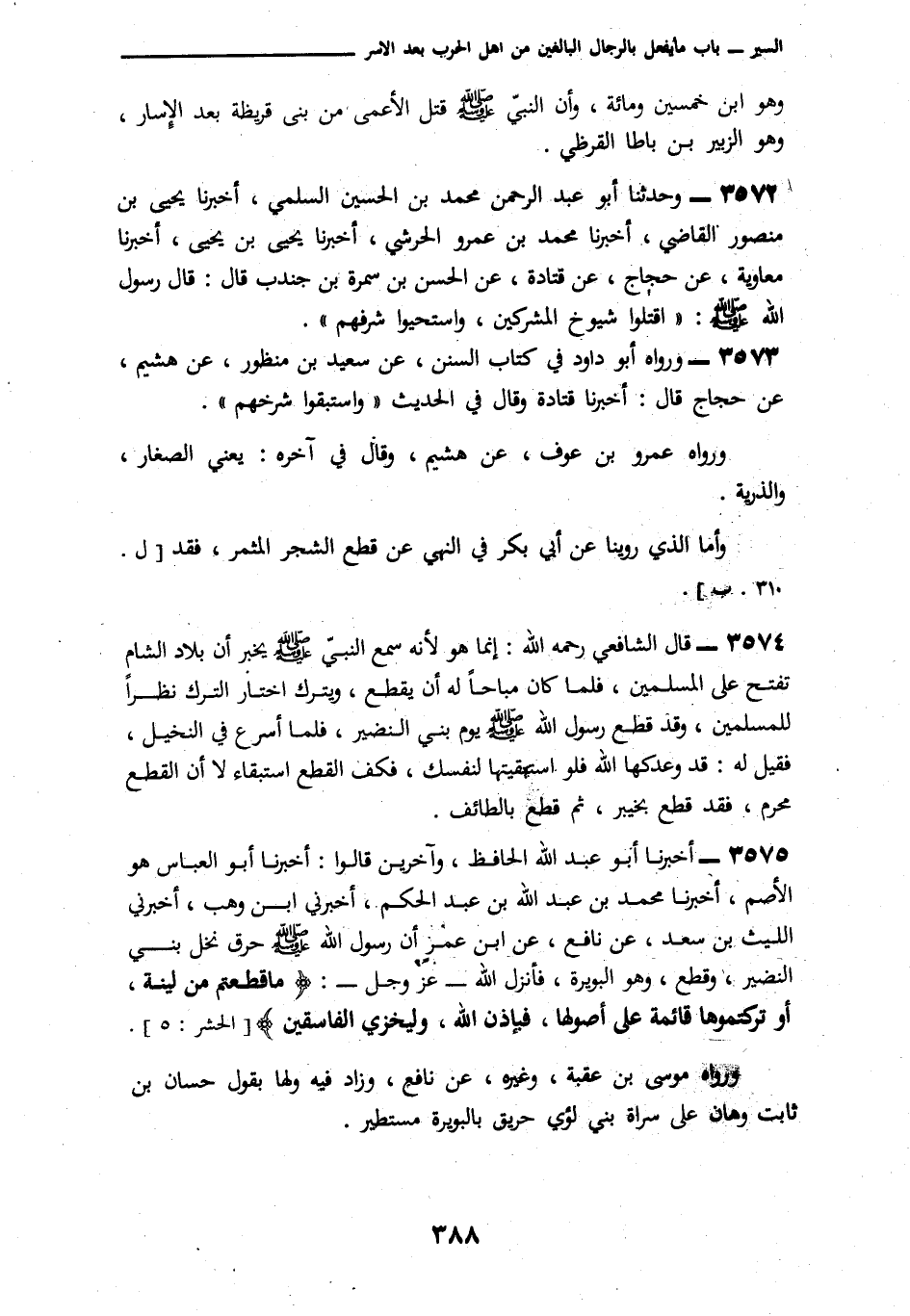 2838 - وَحَدَّثَنَا أَبُو عَبْدِ الرَّحْمَنِ بْنُ الْحُسَيْنِ السُّلَمِيُّ، نا يَحْيَى بْنُ مَنْصُورٍ الْقَاضِي، نا مُحَمَّدُ بْنُ عَمْرٍو الْحَرَشِيُّ، نا يَحْيَى بْنُ يَحْيَى، نا مُعَاوِيَةُ، عَنْ حَجَّاجٍ، عَنْ قَتَادَةَ، عَنِ الْحَسَنِ عَنْ سَمُرَةَ بْنِ جُنْدُبٍ، قَالَ: قَالَ رَسُولُ اللَّهِ صَلَّى اللهُ عَلَيْهِ وَسَلَّمَ: «§اقْتُلُوا شُيُوخَ الْمُشْرِكِينَ، وَاسْتَحْيُوا شَرَفَهُمْ» وَرَوَاهُ أَبُو دَاوُدَ فِي كِتَابِ السُّنَنِ، عَنْ سَعِيدِ بْنِ مَنْصُورٍ، عَنْ هُشَيْمٍ عَنِ حَجَّاجِ قَالَ: أَخْبَرَنَا قَتَادَةُ وَقَالَ فِي الْحَدِيثِ «وَاسْتَبْقُوا شَرْخَهُمْ». وَرَوَاهُ عَمْرُو بْنُ عَوْفٍ، عَنْ هُشَيْمٍ، وَقَالَ فِي آخِرِهِ: يَعْنِي الصِّغَارَ، وَالذُّرِّيَّةَ. وَأَمَّا الَّذِي رُوِّينَا عَنْ أَبِي بَكْرٍ فِي النَّهْي عَنْ قَطْعِ الشَّجَرِ الْمُثْمِرِ فَقَدْ قَالَ الشَّافِعِيُّ رَحِمَهُ اللَّهُ: إِنَّمَا هُوَ لِأَنَّهُ سَمِعَ النَّبِيَّ صَلَّى اللهُ عَلَيْهِ وَسَلَّمَ يُخْبِرُ أَنَّ بِلَادَ الشَّامِ تُفْتَحُ عَلَى الْمُسْلِمِينَ، فَلَمَّا كَانَ مُبَاحًا لَهُ أَنْ يَقْطَعَ، وَيَتْرُكَ اخْتَارَ التَّرْكَ نَظَرًا لِلْمُسْلِمِينَ، وَقَدْ قَطَعَ رَسُولُ اللَّهِ صَلَّى اللهُ عَلَيْهِ وَسَلَّمَ يَوْمَ بَنِي النَّضِيرِ، فَلَمَّا أَسْرَعَ فِي النَّخِيلِ، فَقِيلَ لَهُ: قَدْ وَعَدَكَهَا اللَّهُ فَلَوِ اسْتَبْقَيْتَهَا لِنَفْسِكَ، فَكَفَّ الْقَطْعَ اسْتِبْقَاءً لَا أَنَّ الْقَطْعَ مُحَرَّمٌ، فَقَدْ قَطَعَ بِخَيْبَرَ، ثُمَّ قَطَعَ بِالطَّائِفِ