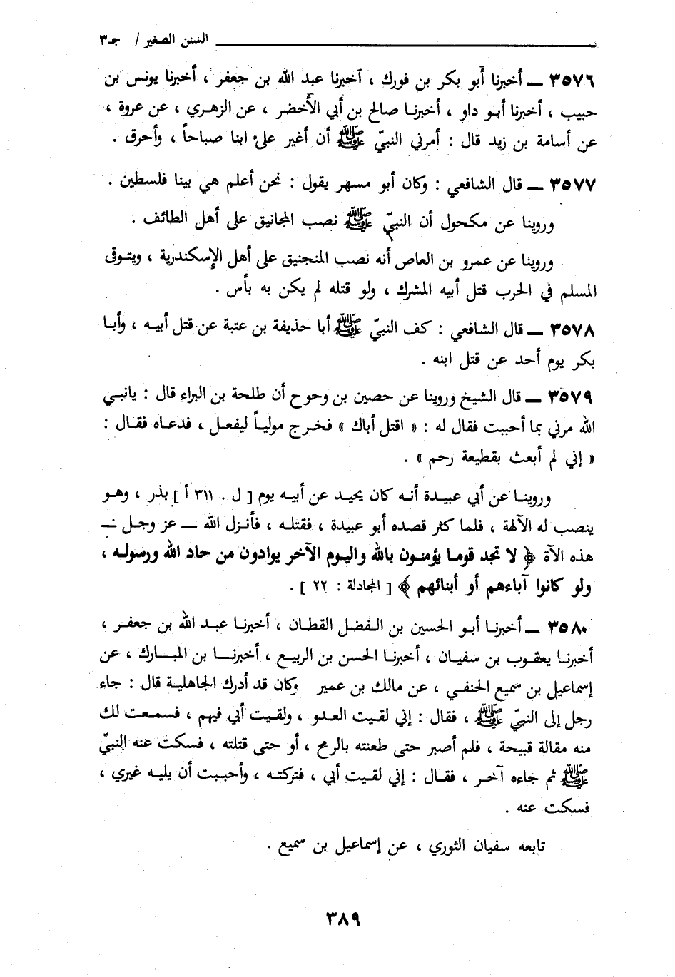 2845 - أَخْبَرَنَا أَبُو الْحُسَيْنِ بْنُ الْفَضْلِ الْقَطَّانُ، نا عَبْدُ اللَّهِ بْنُ جَعْفَرٍ، نا يَعْقُوبُ بْنُ سُفْيَانَ، نا الْحَسَنُ بْنُ الرَّبِيعِ، نا ابْنُ الْمُبَارَكِ، عَنْ إِسْمَاعِيلَ بْنِ سُمَيْعٍ الْحَنَفِيِّ، عَنْ مَالِكِ بْنِ عُمَيْرٍ، وَكَانَ، قَدْ أَدْرَكَ الْجَاهِلِيَّةَ قَالَ: جَاءَ رَجُلٌ إِلَى النَّبِيِّ صَلَّى اللهُ عَلَيْهِ وَسَلَّمَ فَقَالَ: " §إِنِّي لَقِيتُ الْعَدُوَّ، وَلَقِيتُ أَبِي فِيهِمْ، فَسَمِعْتُ لَكَ مِنْهُ مَقَالَةً قَبِيحَةً، فَلَمْ أَصْبِرْ حَتَّى طَعَنْتُهُ بِالرُّمْحِ، أَوْ حَتَّى قَتَلْتُهُ، فَسَكَتَ عَنْهُ النَّبِيُّ صَلَّى اللهُ عَلَيْهِ وَسَلَّمَ ثُمَّ جَاءَهُ آخَرُ، فَقَالَ: إِنِّي لَقِيتُ أَبِي، فَتَرَكْتُهُ، وَأَحْبَبْتُ أَنْ يَلِيَهُ غَيْرِي، فَسَكَتَ عَنْهُ " تَابَعَهُ سُفْيَانُ الثَّوْرِيُّ، عَنْ إِسْمَاعِيلَ بْنِ سُمَيْعٍ