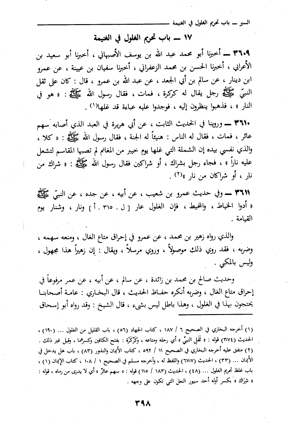 2874 - أَخْبَرَنَا أَبُو مُحَمَّدٍ عَبْدُ اللَّهِ بْنُ يُوسُفَ الْأَصْبَهَانِيُّ، نا أَبُو سَعِيدِ بْنُ الْأَعْرَابِيِّ، نا الْحَسَنُ بْنُ مُحَمَّدٍ الزَّعْفَرَانِيُّ، نا سُفْيَانُ بْنُ عُيَيْنَةَ، عَنْ عَمْرو بْنِ دِينَارٍ، عَنْ سَالِمِ بْنِ أَبِي الْجَعْدِ، عَنْ عَبْدِ اللَّهِ بْنِ عَمْرٍو، قَالَ: كانَ عَلَى ثُقْلِ النَّبِيِّ صَلَّى اللهُ عَلَيْهِ وَسَلَّمَ رَجُلٌ لَهُ كَرْكَرَةٌ، فَمَاتَ، فَقَالَ رَسُولُ اللَّهِ صَلَّى اللهُ عَلَيْهِ وَسَلَّمَ: «§هُوَ فِي النَّارِ» فَذَهَبُوا يَنْظُرُونَ إِلَيْهِ، فَوَجَدُوا عَلَيْهِ عَبَاءَةً قَدْ غَلَّهَا "