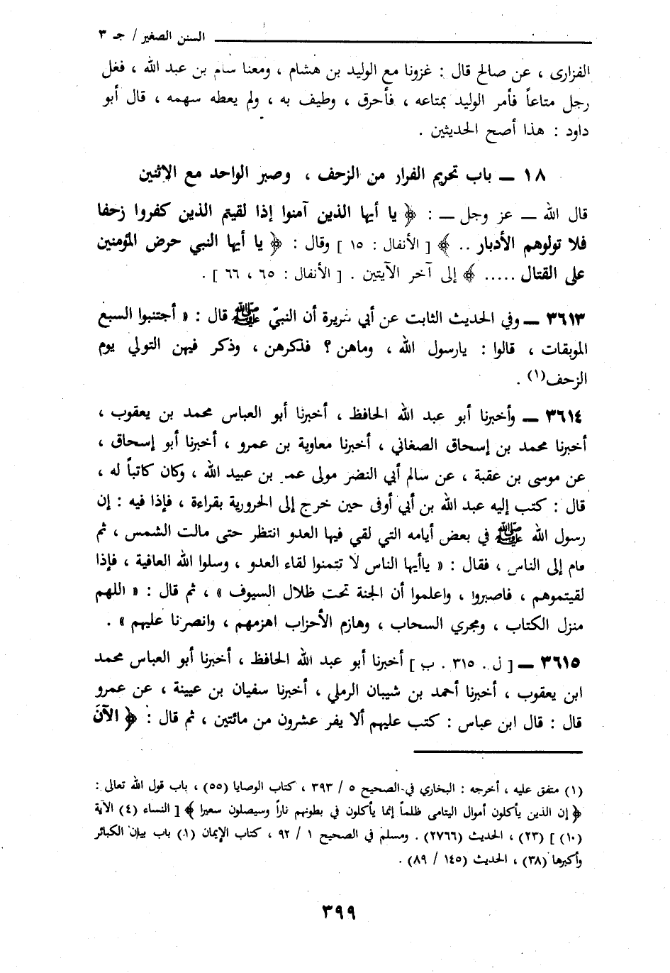 2877 - قَالَ اللَّهُ عَزَّ وَجَلَّ: {يَا أَيُّهَا الَّذِينَ آمَنُوا إِذَا لَقِيتُمُ الَّذِينَ كَفَرُوا زَحْفًا فَلَا تُوَلُّوهُمُ الْأَدْبَارَ} [الأنفال: 15] وَقَالَ: {يَا أَيُّهَا النَّبِيُّ حَرِّضِ الْمُؤْمِنِينَ عَلَى الْقِتَالِ} [الأنفال: 65] إِلَى آخِرِ الْآيَتَيْنِ. وَفِي الْحَدِيثِ الثَّابِتِ، عَنْ أَبِي هُرَيْرَةَ أَنَّ النَّبِيَّ صَلَّى اللهُ عَلَيْهِ وَسَلَّمَ قَالَ: «§اجْتَنِبُوا السَّبْعَ الْمُوبِقَاتِ» قَالُوا: يَا رَسُولَ اللَّهِ، وَمَا هُنَّ؟ فَذَكَّرَهُنَّ، وَذَكَرَ فِيهِنَّ التَّوَلِّي يَوْمَ الزَّحْفِ "