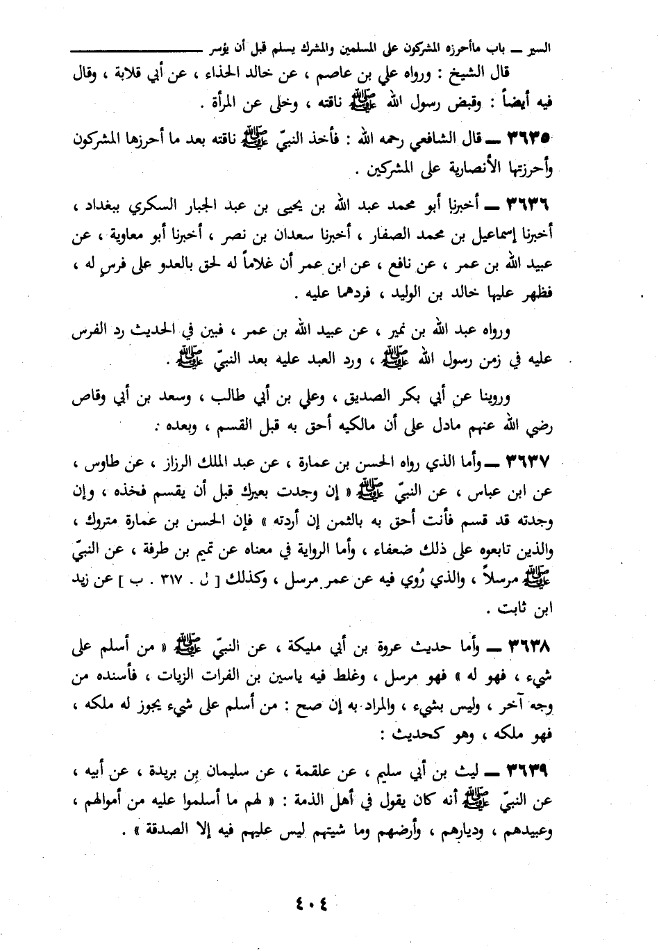 2893 - وَرُوِّينَا عَنْ أَبِي بَكْرٍ الصِّدِّيقِ، وَعَلِيِّ بْنِ أَبِي طَالِبٍ، وَسَعْدِ بْنِ أَبِي وَقَّاصٍ، رَضِيَ اللَّهُ عَنْهُمْ، مَا دَلَّ عَلَى أَنَّ مَالِكَهُ أَحَقُّ بِهِ قَبْلَ الْقَسْمِ، وَبَعْدَهُ. وَأَمَّا الَّذِي رَوَاهُ الْحَسَنُ بْنُ عُمَارَةَ، عَنْ عَبْدِ الْمَلِكِ الرَّزَّادِ، عَنْ طَاوُسٍ، عَنِ ابْنِ عَبَّاسٍ، عَنِ النَّبِيِّ صَلَّى اللهُ عَلَيْهِ وَسَلَّمَ: «§إِنْ وَجَدْتَ بَعِيرَكَ قَبْلَ أَنْ يُقْسَمَ فَخُذْهُ، وَإِنْ وَجَدْتَهُ قَدْ قُسِمَ فَأَنْتَ أَحَقُّ بِهِ بِالثَّمَنِ إِنْ أَرَدْتَهُ» فَإِنَّ الْحَسَنَ بْنَ عُمَارَةَ مَتْرُوكٌ، وَالَّذِينَ تَابَعُوهُ عَلَى ذَلِكَ ضُعَفَاءُ، وَأَمَّا الرِّوَايَةُ فِي مَعْنَاهُ عَنْ تَمِيْمِ بْنِ طَرَفَةَ، عَنِ النَّبِيِّ صَلَّى اللهُ عَلَيْهِ وَسَلَّمَ مُرْسَلًا، وَالَّذِي رُوِيَ فِيهِ عَنْ عُمَرَ مُرْسَلٌ، وَكَذَلِكَ عَنْ زَيْدِ بْنِ ثَابِتٍ وَأَمَّا حَدِيثُ عُرْوَةَ بْنِ أَبِي مُلَيْكَةَ، عَنِ النَّبِيِّ صَلَّى اللهُ عَلَيْهِ وَسَلَّمَ «مَنْ أَسْلَمَ عَلَى شَيْءٍ، فَهُوَ لَهُ» فَهُوَ مُرْسَلٌ، وغَلَطَ فِيهِ يَاسِينُ بْنُ الْفُرَاتِ الزَّيَّاتُ، فَأَسْنَدَهُ مِنْ وَجْهٍ آخَرَ، وَلَيْسَ بِشَيْءٍ، وَالْمُرَادُ بِهِ إِنْ صَحَّ: مَنْ أَسْلَمَ عَلَى شَيْءٍ يَجُوزُ لَهُ مِلْكُهُ فَهُوَ مِلْكُهُ. وَهُوَ كَحَدِيثِ لَيْثِ بْنِ أَبِي سُلَيْمٍ، عَنْ عَلْقَمَةَ، عَنْ سُلَيْمَانَ بْنِ بُرَيْدَةَ، عَنْ أَبِيهِ، عَنِ النَّبِيِّ صَلَّى اللهُ عَلَيْهِ وَسَلَّمَ أَنَّهُ كَانَ يَقُولُ فِي أَهْلِ الذِّمَّةِ: «لَهُمْ مَا أَسْلَمُوا عَلَيْهِ مِنْ أَمْوَالِهِمْ، وَعَبِيدِهِمْ، وَدِيَارِهِمْ، وَأَرْضِهِمْ وَمَاشِيَتِهِمْ لَيْسَ عَلَيْهِمْ فِيهِ إِلَّا الصَّدَقَةُ» -[405]- أَخْبَرَنَا أَبُو عَبْدِ اللَّهِ الْحَافِظُ، نا أَبُو الْعَبَّاسِ مُحَمَّدُ بْنُ يَعْقُوبَ، نا الْعَبَّاسُ بْنُ مُحَمَّدٍ الدُّورِيُّ، نا أَبُو شَيْخٍ الْحَرَّانِيُّ، نَا مُوسَى بْنُ أَعْيَنَ، عَنْ لَيْثِ بْنِ أَبِي سُلَيْمٍ، فَذَكَرَهُ. وَشَاهِدُ حَدِيثِ الصَّخْرِ بْنِ الْعَيْلَةَ، عَنِ النَّبِيِّ صَلَّى اللهُ عَلَيْهِ وَسَلَّمَ أَنَّهُ قَالَ: «يَا صَخْرُ إِنَّ الْقَوْمَ إِذَا أَسْلَمُوا أَحْرَزُوا دِمَاءَهُمْ وَأَمْوَالَهُمْ» وَهَذَا كُلُّهُ فِيمَنْ أَسْلَمَ قَبْلَ وُقُوعِهِ فِي الْأَسْرِ، وَفِي مَعْنَى هَذَا قِصَّةُ بَنِي شُعْبَةَ، فَإِنَّهُمَا أَسْلَمَا، وَرَسُولُ اللَّهِ صَلَّى اللهُ عَلَيْهِ وَسَلَّمَ، مُحَاصِرٌ بَنِي قُرَيْظَةَ، فَأَحْرَزَ لَهُمَا إِسْلَامُهُمَا أَنْفُسَهُمَا، وَأَمْوَالَهُمَا مِنَ النَّخْلِ وَالْأَرْضِ وَغَيْرِهَا ". وَفِي مَعْنَى هَذَا حَدِيثُ ابْنِ عَبَّاسٍ قَالَ: لَقِيَ نَاسٌ مِنَ الْمُسْلِمِينَ رَجُلًا فِي غَنِيمَةٍ لَهُ فَقَالَ: السَّلَامُ عَلَيْكُمْ، فَأَخَذُوهُ، وَقَتَلُوهُ، وَأَخَذُوا تِلْكَ الْغَنِيمَةَ فَنَزَلَتْ: (وَلَا تَقُولُوا لِمَنْ أَلْقَى إِلَيْكُمُ السَّلَمَ لَسْتَ مُؤْمِنًا) وَقَرَأَهَا ابْنُ عَبَّاسٍ: {السَّلَامَ} [النساء: 94]. أَخْبَرَنَاهُ أَبُو عَبْدِ اللَّهِ الْحَافِظُ، نا أَبُو الْفَضْلِ بْنُ إِبْرَاهِيمَ، نا أَحْمَدُ بْنُ سَلَمَةَ، نا إِسْحَاقُ بْنُ إِبْرَاهِيمَ، نا سُفْيَانُ، عَنْ عَمْرٍو، عَنْ عَطَاءٍ، عَنِ ابْنِ عَبَّاسٍ، فَذَكَرَهُ