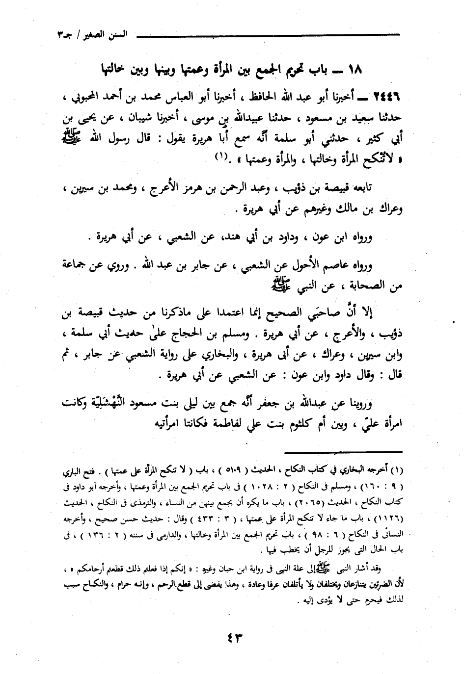 2446 - أَخْبَرَنَا أَبُو عَبْدِ اللَّهِ الْحَافِظُ، أنا أَبُو الْعَبَّاسِ مُحَمَّدُ بْنُ أَحْمَدَ الْمَحْبُوبِيُّ، ثنا سَعِيدُ بْنُ مَسْعُودٍ، ثنا عُبَيْدُ اللَّهِ بْنُ مُوسَى، أنا شَيْبَانُ، عَنْ يَحْيَى بْنِ أَبِي كَثِيرٍ، ثَنِي أَبُو سَلَمَةَ أَنَّهُ سَمِعَ أَبَا هُرَيْرَةَ، يَقُولُ: قَالَ رَسُولُ اللَّهِ صَلَّى اللهُ عَلَيْهِ وَسَلَّمَ: «§لَا تُنْكَحُ الْمَرْأَةُ وَخَالَتُهَا، وَلَا الْمَرْأَةُ وَعَمَّتُهَا» تَابَعَهُ قَبِيصَةُ بْنُ ذُؤَيْبٍ، وَعَبْدُ الرَّحْمَنِ بْنُ هُرْمُزَ الْأَعْرَجُ، وَمُحَمَّدُ بْنُ سِيرِينَ، وَعِرَاكُ بْنُ مَالِكٍ، وَغَيْرُهُمْ عَنْ أَبِي هُرَيْرَةَ، وَرَوَاهُ ابْنُ عَوْنٍ، وَدَاوُدُ بْنُ أَبِي هِنْدٍ، عَنِ الشَّعْبِيِّ، عَنْ أَبِي هُرَيْرَةَ وَرَوَاهُ عَاصِمٌ الْأَحْوَلُ، عَنِ الشَّعْبِيِّ، عَنْ جَابِرِ بْنِ عَبْدِ اللَّهِ، وَرُوِيَ عَنْ جَمَاعَةٍ، مِنَ الصَّحَابَةِ، عَنِ النَّبِيِّ صَلَّى اللهُ عَلَيْهِ وَسَلَّمَ إِلَّا أَنَّ صَاحِبَيِ الصَّحِيحِ إِنَّمَا اعْتَمَدَا عَلَى مَا ذَكَرْنَا مِنْ حَدِيثِ قَبِيصَةَ بْنِ ذُؤَيْبٍ، وَالْأَعْرَجِ عَنْ أَبِي هُرَيْرَةَ وَمُسْلِمُ بْنُ الْحَجَّاجِ عَلَى حَدِيثِ أَبِي سَلَمَةَ، وَابْنِ سِيرِينَ، وَعِرَاكٍ عَنْ أَبِي هُرَيْرَةَ، وَالْبُخَارِيُّ عَلَى رِوَايَةِ الشَّعْبِيِّ عَنْ جَابِرٍ، ثُمَّ قَالَ: وقَالَ دَاوُدُ، وَابْنُ عَوْنٍ عَنِ الشَّعْبِيِّ عَنْ أَبِي هُرَيْرَةَ.