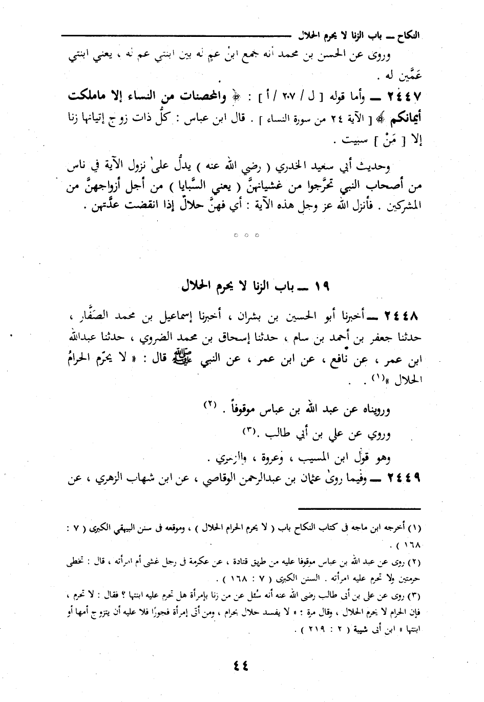 2448 - أَخْبَرَنَا أَبُو الْحُسَيْنِ بْنُ بِشْرَانَ، أنا إِسْمَاعِيلُ بْنُ مُحَمَّدٍ الصَّفَّارُ، ثنا جَعْفَرُ بْنُ أَحْمَدَ بْنِ بسَّامٍ، ثنا إِسْحَاقُ بْنُ مُحَمَّدٍ الْفَرْوِيُّ، ثنا عَبْدُ اللَّهِ بْنُ عُمَرَ، عَنْ نَافِعٍ، عَنِ ابْنِ عُمَرَ، عَنِ النَّبِيِّ صَلَّى اللهُ عَلَيْهِ وَسَلَّمَ قَالَ: § «لَا يُحَرِّمُ الْحَرَامُ الْحَلَالَ» وَرُوِّينَا عَنْ عَبْدِ اللَّهِ بْنِ عَبَّاسٍ، مَوْقُوفًا، وَرُوِيَ عَنْ عَلِيِّ بْنِ أَبِي طَالِبٍ، وَهُوَ قَوْلُ ابْنِ الْمُسَيِّبِ وَعُرْوَةَ، وَالزُّهْرِيِّ