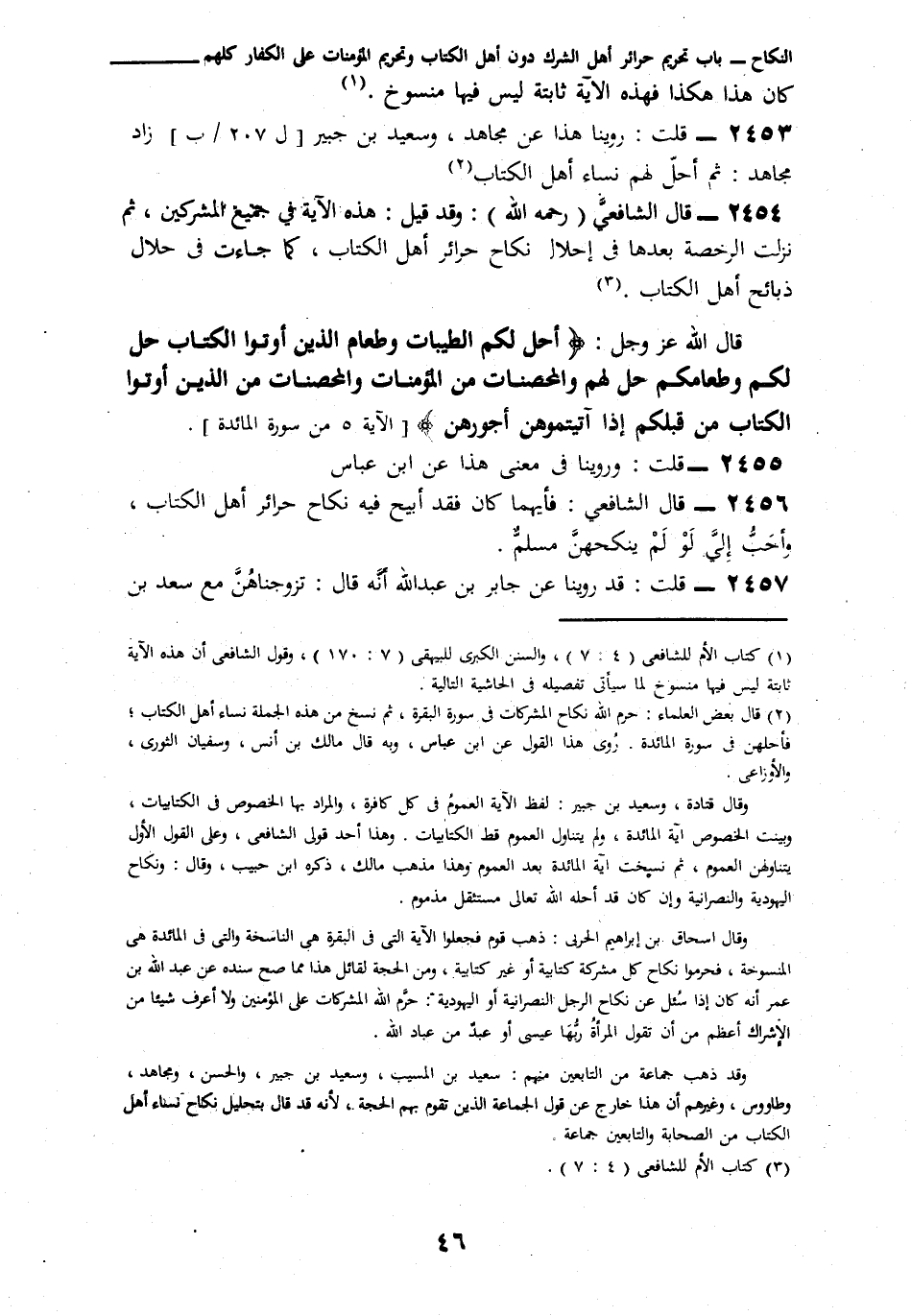 2454 - قَالَ الشَّافِعِيُّ رَحِمَهُ اللَّهُ وَقَدْ قِيلَ: «§هَذِهِ الْآيَةُ فِي جَمِيعِ الْمُشْرِكِينَ، ثُمَّ نَزَلَتِ الرُّخْصَةُ بَعْدَهَا فِي إِحْلَالِ نِكَاحِ الْحَرَائِرِ مِنْ أَهْلِ الْكِتَابِ خَاصَّةً، كَمَا جَاءَتْ فِي إِحْلَالِ ذَبَائِحِ أَهْلِ الْكِتَابِ» قَالَ اللَّهُ تَعَالَى: {«الْيَوْمَ أُحِلَّ لَكُمُ الطَّيِّبَاتُ، وَطَعَامُ الَّذِينَ أُوتُوا الْكِتَابَ حِلٌّ لَكُمْ، وَطَعَامُكُمْ حِلٌّ لَهُمْ، وَالْمُحْصَنَاتُ مِنَ الْمُؤْمِنَاتِ، وَالْمُحْصَنَاتُ مِنَ الَّذِينَ أُوتُوا الْكِتَابَ مِنْ قَبْلِكُمْ إِذَا آتَيْتُمُوهُنَّ أُجُورَهُنَّ»} [المائدة: 5]