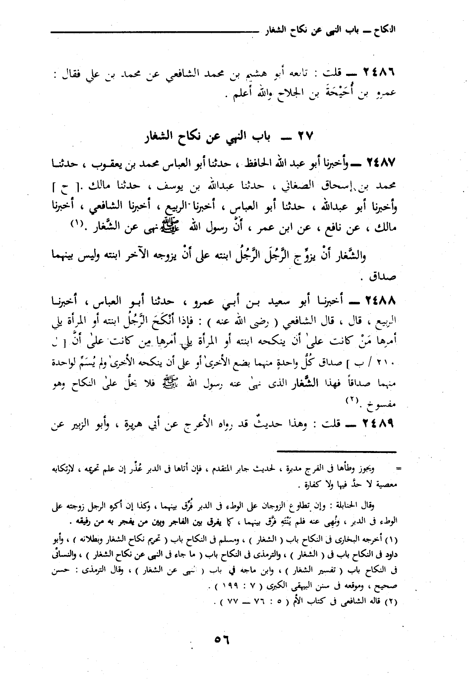 2488 - أنا أَبُو سَعِيدِ بْنُ أَبِي عَمْرٍو، ثنا أَبُو الْعَبَّاسِ، أنا الرَّبِيعُ، قَالَ: قَالَ الشَّافِعِيُّ رَضِيَ اللَّهُ عَنْهُ: § «إِذَا أَنْكَحَ الرَّجُلُ ابْنَتَهُ الرَّجُلَ أَوِ الْمَرْأَةَ يَلِي أَمْرَهَا مَنْ كَانَتْ عَلَى أَنْ يُنْكِحَهُ ابْنَتَهُ أَوِ الْمَرْأَةَ يَلِي أَمْرَهَا مَنْ كَانَتْ عَلَى أَنَّ صَدَاقَ كُلِّ وَاحِدَةٍ مِنْهُمَا بِضْعُ الْأُخْرَى أَوْ عَلَى أَنْ يُنْكِحَهُ الْأُخْرَى وَلَمْ يُسَمِّ لِوَاحِدَةٍ مِنْهُمَا صَدَاقًا، فَهَذَا الشِّغَارُ الَّذِي نَهَى عَنْهُ رَسُولُ اللَّهِ صَلَّى اللهُ عَلَيْهِ وَسَلَّمَ فَلَا يَحِلُّ النِّكَاحِ، وَهُوَ مَنْسُوخٌ»