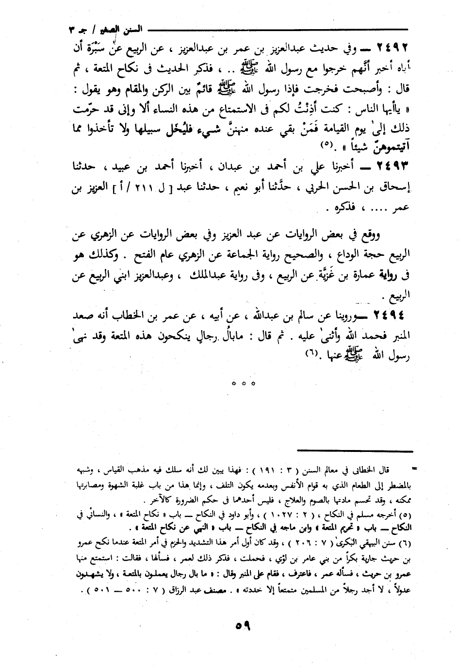 2492 - وَفِي حَدِيثِ عَبْدِ الْعَزِيزِ بْنِ عُمَرَ بْنِ عَبْدِ الْعَزِيزِ، عَنِ الرَّبِيعِ بْنِ سَبْرَةَ أَنَّ أَبَاهُ أَخْبَرَ أَنَّهُمْ خَرَجُوا مَعَ رَسُولِ اللَّهِ صَلَّى اللهُ عَلَيْهِ وَسَلَّمَ فَذَكَرَ الْحَدِيثَ فِي نِكَاحِ الْمُتْعَةِ ثُمَّ قَالَ: وَأَصْبَحْتُ فَخَرَجْتُ فَإِذَا رَسُولُ اللَّهِ صَلَّى اللهُ عَلَيْهِ وَسَلَّمَ قَائِمٌ بَيْنَ الرُّكْنِ وَالْمَقَامِ وَهُوَ يَقُولُ: يَا أَيُّهَا النَّاسُ: § «كُنْتُ أَذِنْتُ لَكُمْ فِي الِاسْتِمْتَاعِ مِنْ هَذِهِ النِّسَاءِ أَلَا وَإِنِّي حَرَّمْتُ ذَلِكَ إِلَى يَوْمِ الْقِيَامَةِ، فَمَنْ بَقِيَ عِنْدَهُ مِنْهُنَّ شَيْءٌ فَلْيُخَلِّ سَبِيلَهَا، وَلَا تَأْخُذُوا مِمَّا آتَيْتُمُوهُنَّ شَيْئًا»