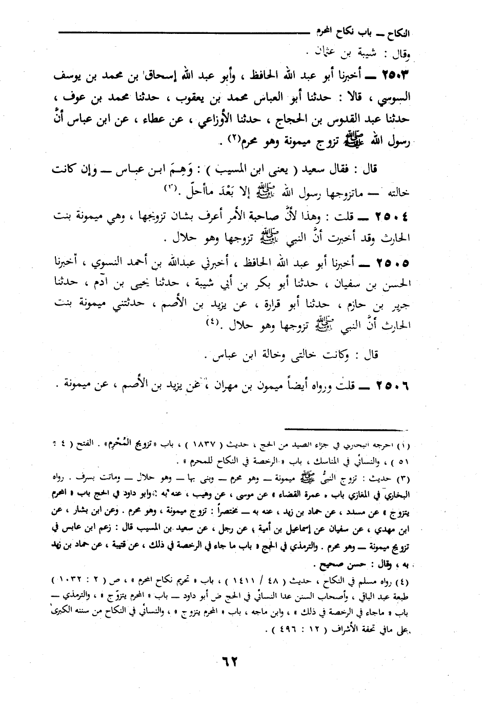 2504 - قُلْتُ: «وَهَذَا لِأَنَّ صَاحِبَةَ الْأَمْرِ أَعْرَفُ بِشَأْنِ تَزْوِيجِهَا، وَهِيَ مَيْمُونَةُ بِنْتُ الْحَارِثِ، وَقَدْ أُخْبِرْتُ أَنَّ النَّبِيَّ صَلَّى اللهُ عَلَيْهِ وَسَلَّمَ تَزَوَّجَهَا وَهُوَ حَلَالٌ»