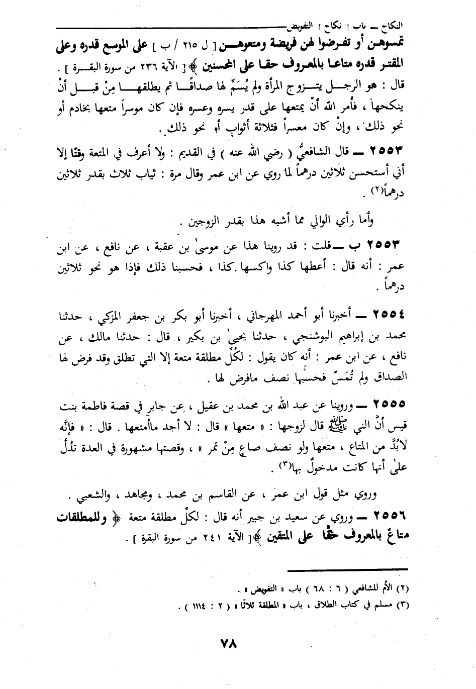 2554 - أَخْبَرَنَا أَبُو أَحْمَدَ الْمِهْرَجَانِيُّ، أَنَا أَبُو بَكْرِ بْنُ جَعْفَرٍ الْمُزَكِّي، ثنا مُحَمَّدُ بْنُ إِبْرَاهِيمَ الْبُوشَنْجِيُّ، ثنا يَحْيَى بْنُ بُكَيْرٍ، قَالَ: ثنا مَالِكٌ، عَنْ نَافِعٍ، عَنِ ابْنِ عُمَرَ،: أَنَّهُ كَانَ يَقُولُ: «§لِكُلِّ مُطَلَّقَةٍ مُتْعَةٌ إِلَّا الَّتِي تُطَلَّقُ، وَقَدْ فُرِضَ لَهَا الصَّدَاقُ، وَلَمْ تُمَسَّ، فَحَسْبُهَا نِصْفُ مَا فُرِضَ لَهَا»