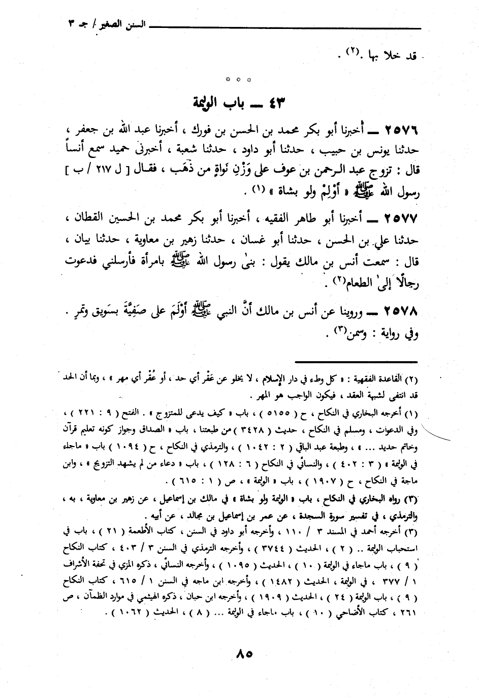 2578 - وَرُوِّينَا عَنْ أَنَسِ بْنِ مَالِكٍ،: أَنَّ النَّبِيَّ صَلَّى اللهُ عَلَيْهِ وَسَلَّمَ " §أَوْلَمَ عَلَى صَفِيَّةَ بِسَوِيقٍ، وَتَمْرٍ وَفِي رِوَايَةٍ أُخْرَى: سَمْنٍ " -[86]-