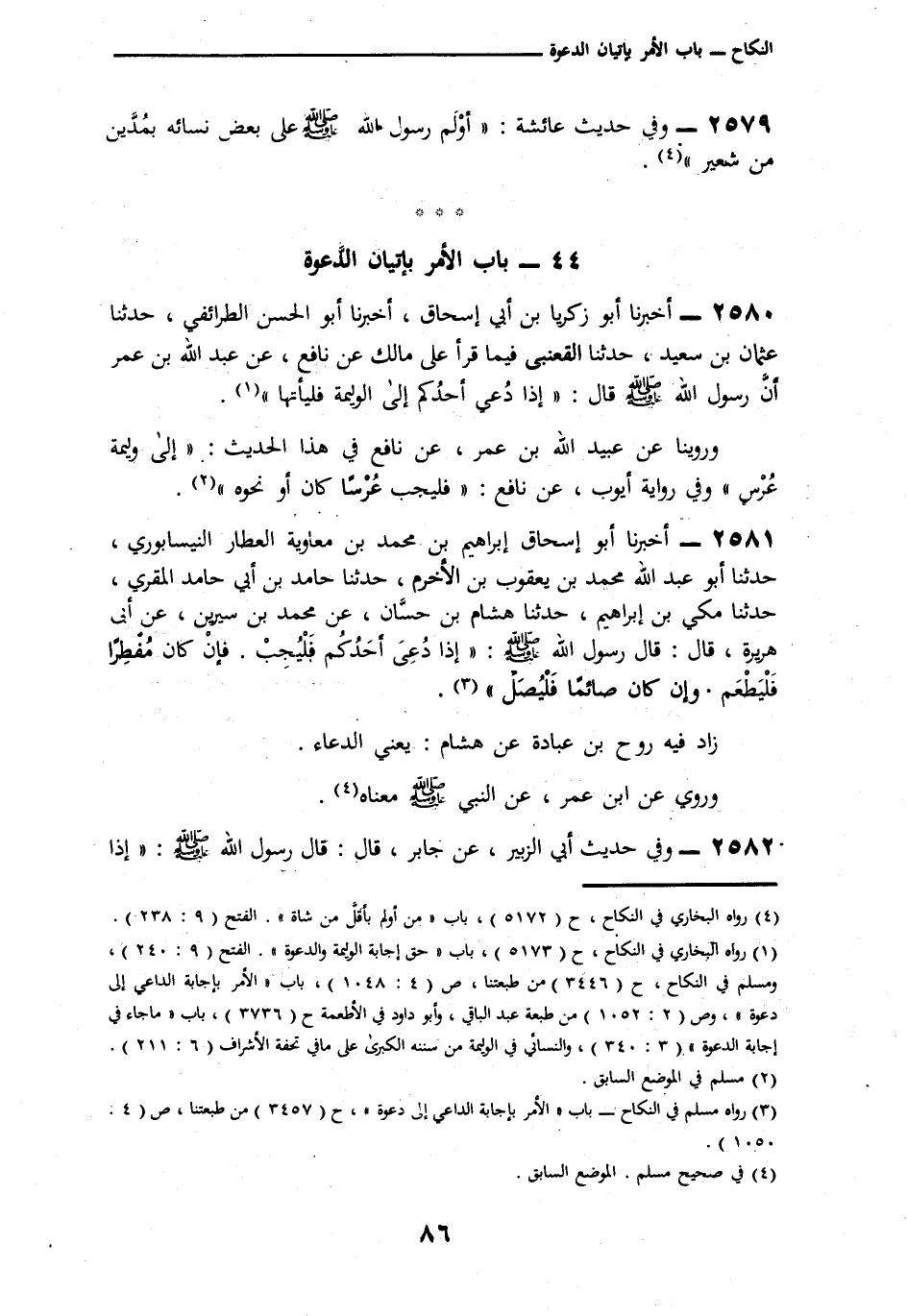 2580 - أَخْبَرَنَا أَبُو زَكَرِيَّا بْنُ أَبِي إِسْحَاقَ، أنا أَبُو الْحَسَنِ الطَّرَائِفِيُّ، ثنا عُثْمَانُ بْنُ سَعِيدٍ، ثنا الْقَعْنَبِيُّ، فِيمَا قَرَأَ عَلَى مَالِكٍ عَنْ نَافِعٍ، عَنْ عَبْدِ اللَّهِ بْنِ عُمَرَ، أَنَّ رَسُولَ اللَّهِ صَلَّى اللهُ عَلَيْهِ وَسَلَّمَ قَالَ: § «إِذَا دُعِيَ أَحَدُكُمْ إِلَى الْوَلِيمَةِ فَلْيَأْتِهَا» وَرُوِّينَا عَنْ عُبَيْدِ اللَّهِ بْنِ عُمَرَ، عَنْ نَافِعٍ فِي هَذَا الْحَدِيثِ: «إِلَى وَلِيمَةِ عُرْسٍ» وَفِي رِوَايَةِ أَيُّوبَ، عَنْ نَافِعٍ: «فَلْيُجِبْ، عُرْسًا كَانَ أَوْ نَحْوَهُ»
