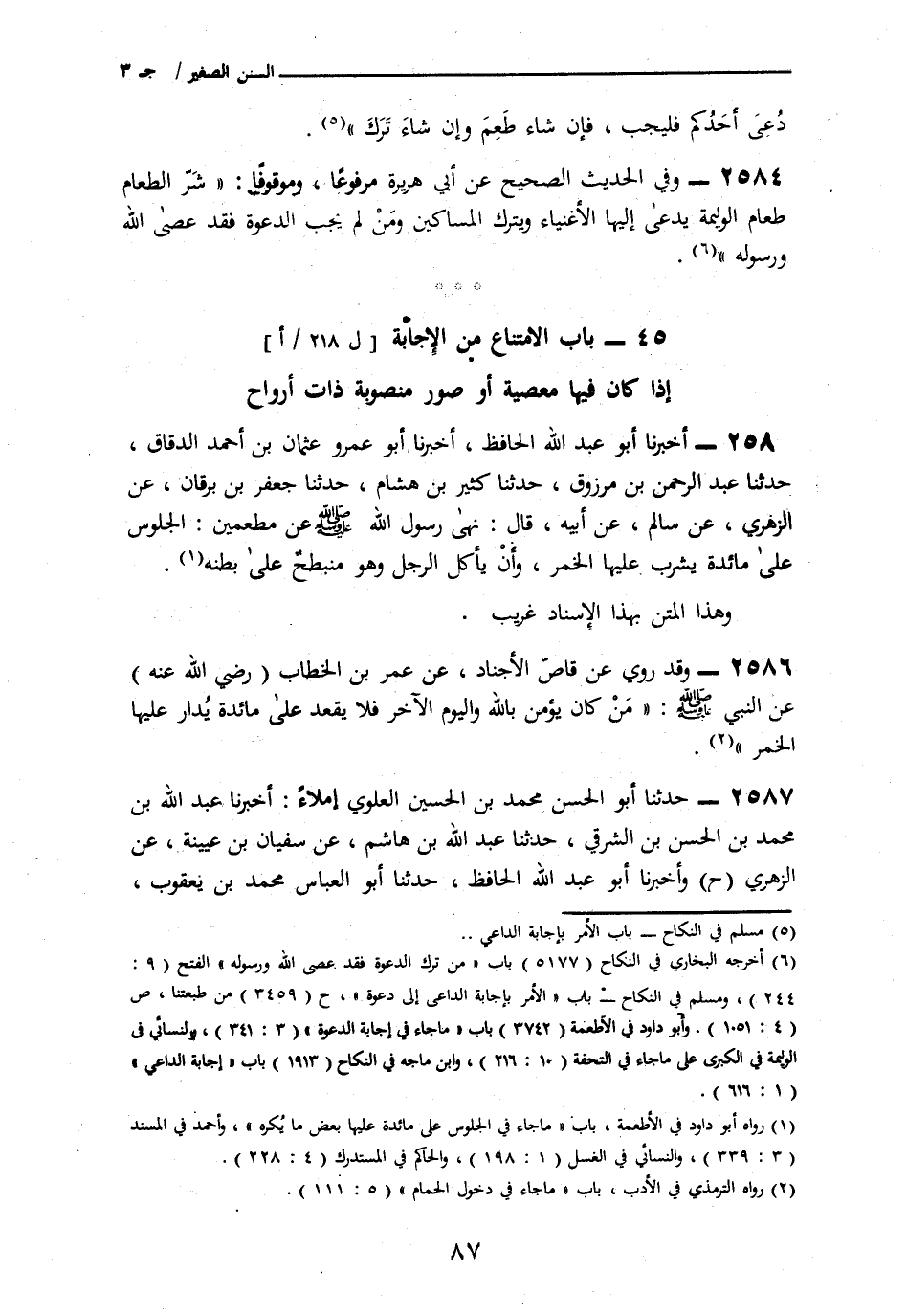 2584 - وَفِي الْحَدِيثِ الصَّحِيحِ عَنْ أَبِي هُرَيْرَةَ، مَرْفُوعًا، وَمَوْقُوفًا: «§شَرُّ الطَّعَامِ طَعَامُ الْوَلِيمَةِ يُدْعَى إِلَيْهَا الْأَغْنِيَاءُ، وَيُتْرَكُ الْمَسَاكِينُ، وَمَنْ لَمْ يُجِبِ الدَّعْوَةَ فَقَدْ عَصَى اللَّهَ وَرَسُولَهُ»
