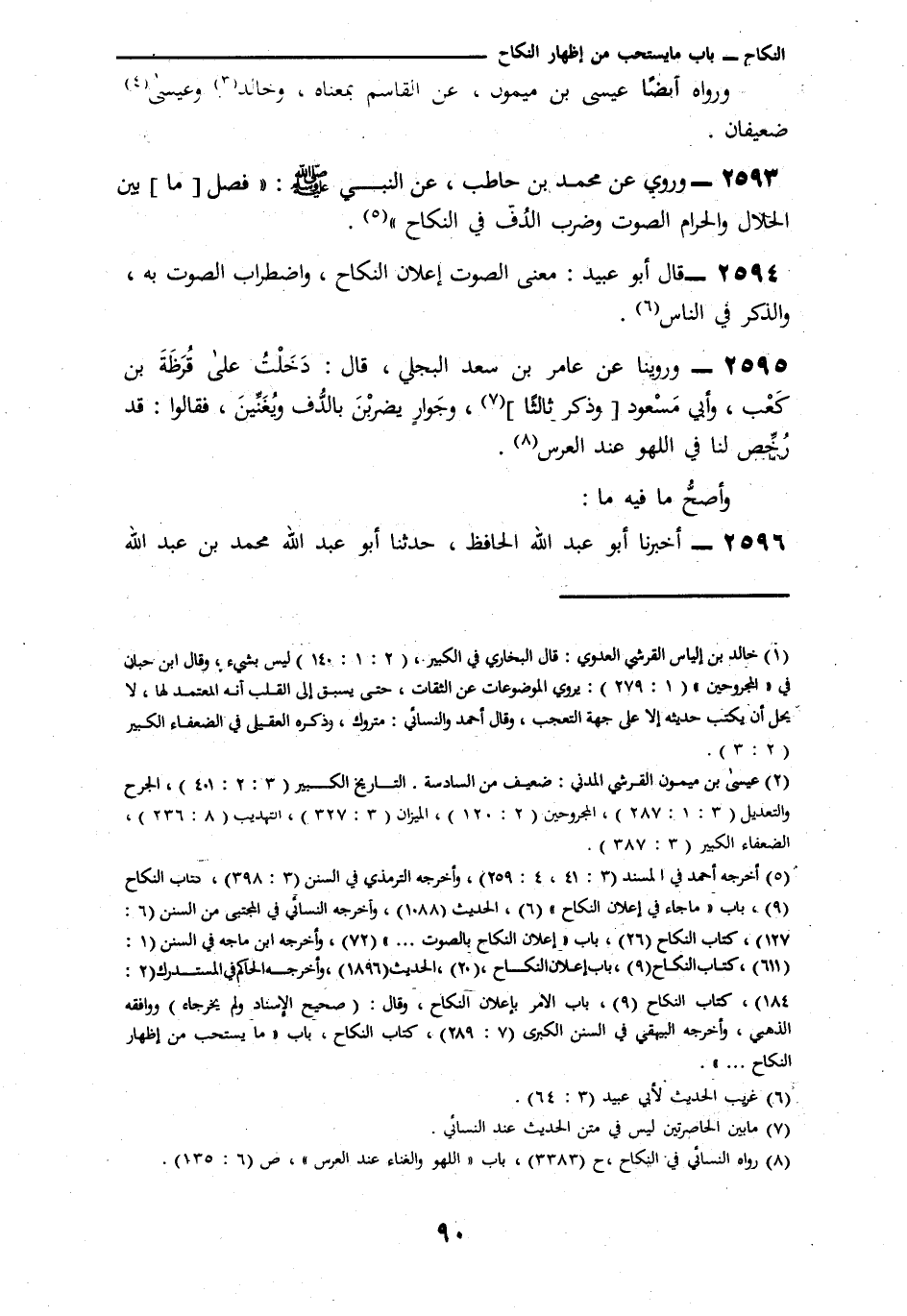 2593 - وَرُوِيَ عَنْ مُحَمَّدِ بْنِ حَاطِبٍ، عَنِ النَّبِيِّ صَلَّى اللهُ عَلَيْهِ وَسَلَّمَ مُرْسَلًا: «§فَصْلُ مَا بَيْنَ الْحَلَالِ وَالْحَرَامِ الصَّوْتُ، وَضَرْبُ الدُّفِّ فِي النِّكَاحِ»،